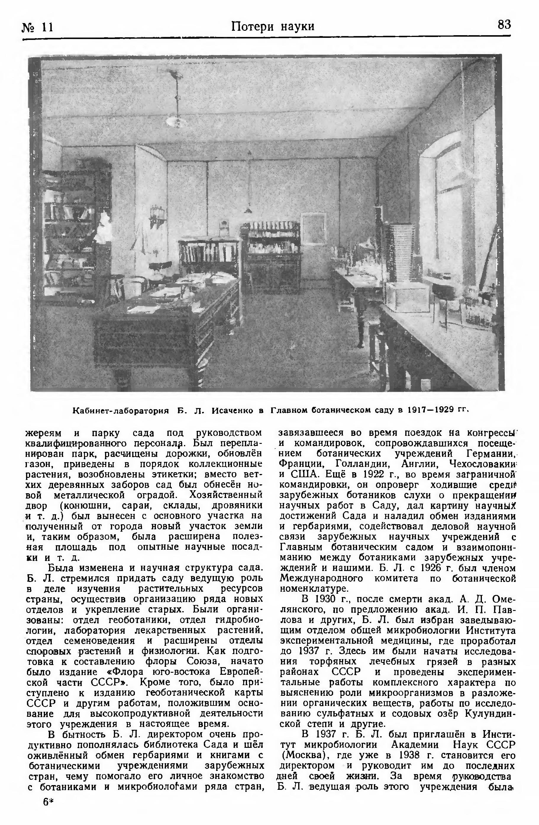 Добавим еще, что Б. Л. является не только серьезным исследователем, но и организатором научных сил и пробудителем творческой научной мысли. Он основал Микробиологическое общество и был некоторое время его председателем, Б. Л. был и организатором и первым председателем группы СССР общества „Аэроарктик". В этой роли Б. Л. провел в 1928 г. большую работу по подготовке конгресса "Аэроарктик" в Ленинграде и принимал участие в работах его центра в Берлине.