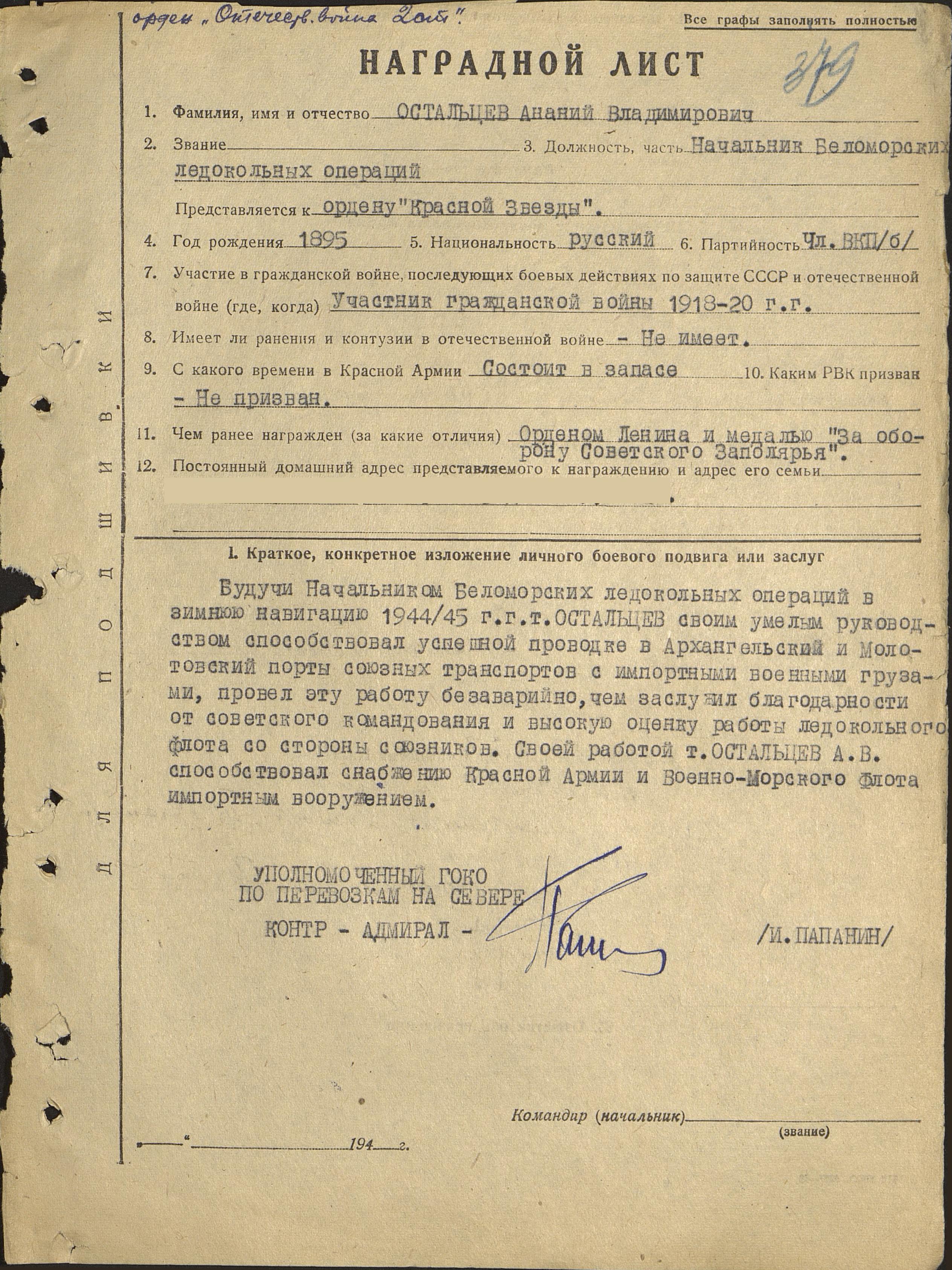 Мой дед - один из руководителей морского управления Главсевморпути А. В. Остальцев. Начальник Экспедиции по спасению станции “СП-1”. Начальник экспедиции "ЭОН-18"