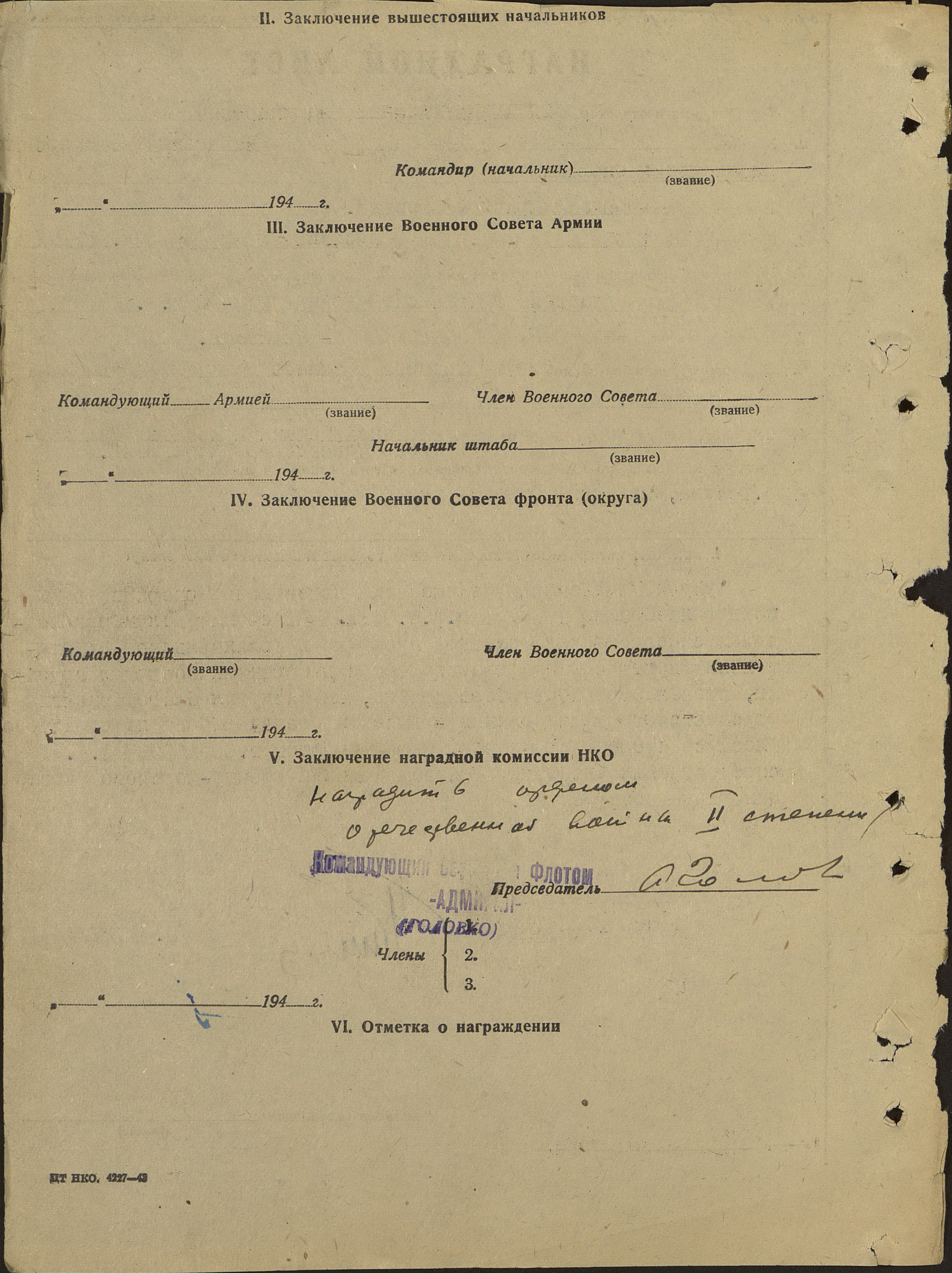 Наградной лист: фонд 3 опись 1 единица хранения 1489