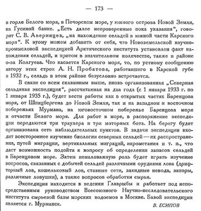 Более подробные сведения об этой экспедиции помещены в статье начальника экспедиции, проф. С. В. Аверинцева, напечатанной в №1 журнала „Рыбное хозяйство СССР" за этот год. В ней содержится ряд интересных данных, касающихся вообще сельдяной проблемы в Баренцовом море.