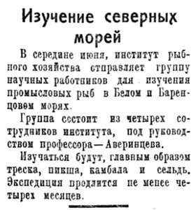 ЭКСПЕДИЦИЯ ДЛЯ ИЗУЧЕНИЯ СЕЛЬДИ, ее распространения в Баренцовом море по сезонам, определения запасов — организована Народным Комиссариатом Снабжения. Начальником экспедиции назначен проф. Аверинцев.