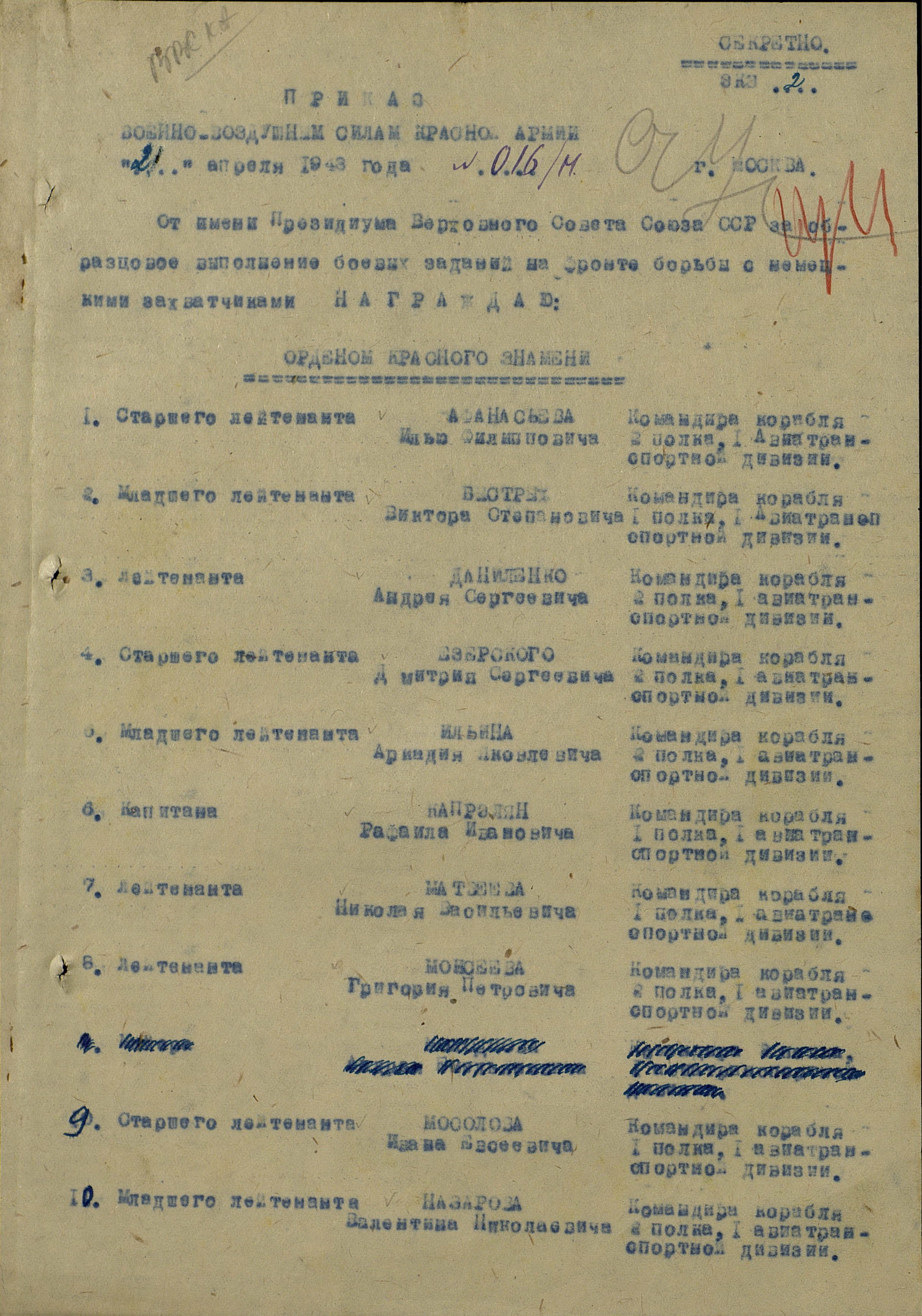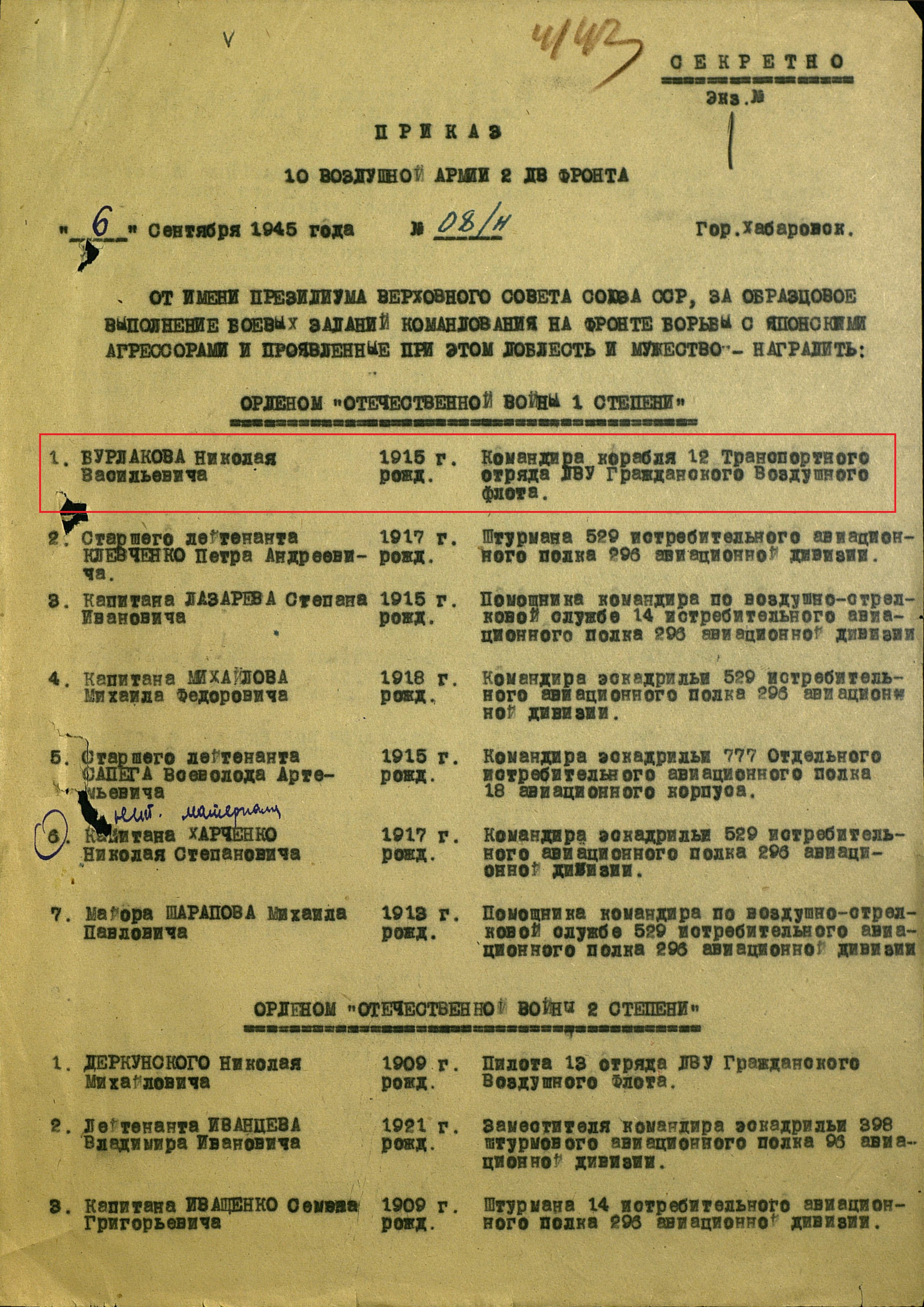 За 4 ночных вылета в период с 15 по 20.8.45 г. в глубокий тыл противника в сложных метеорологических условиях с боевыми заданиями по переброске разведчиков-парашютистов Разведотдела Штаба 2 ДВФ, причем разведчики были выброшены точно в указанный район, достоин награждения правительственной наградой орденом "ОТЕЧЕСТВЕННОЙ ВОЙНЫ I СТЕПЕНИ".