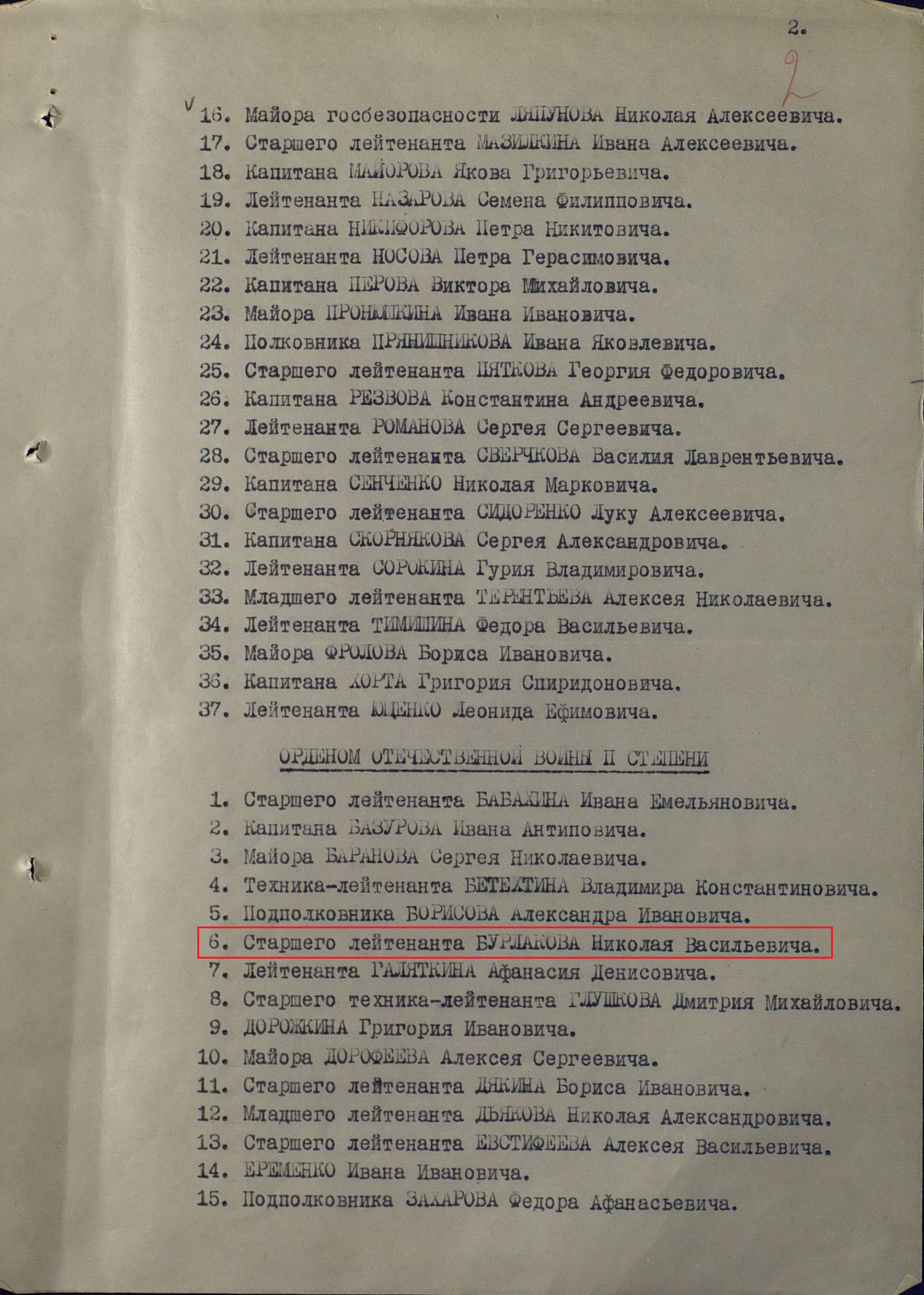 Ходатайствую о награждении тов. БУРЛАКОВА Николая Васильевича правительственной наградой Орденом "ОТЕЧЕСТВЕННОЙ ВОЙНЫ II СТЕПЕНИ".