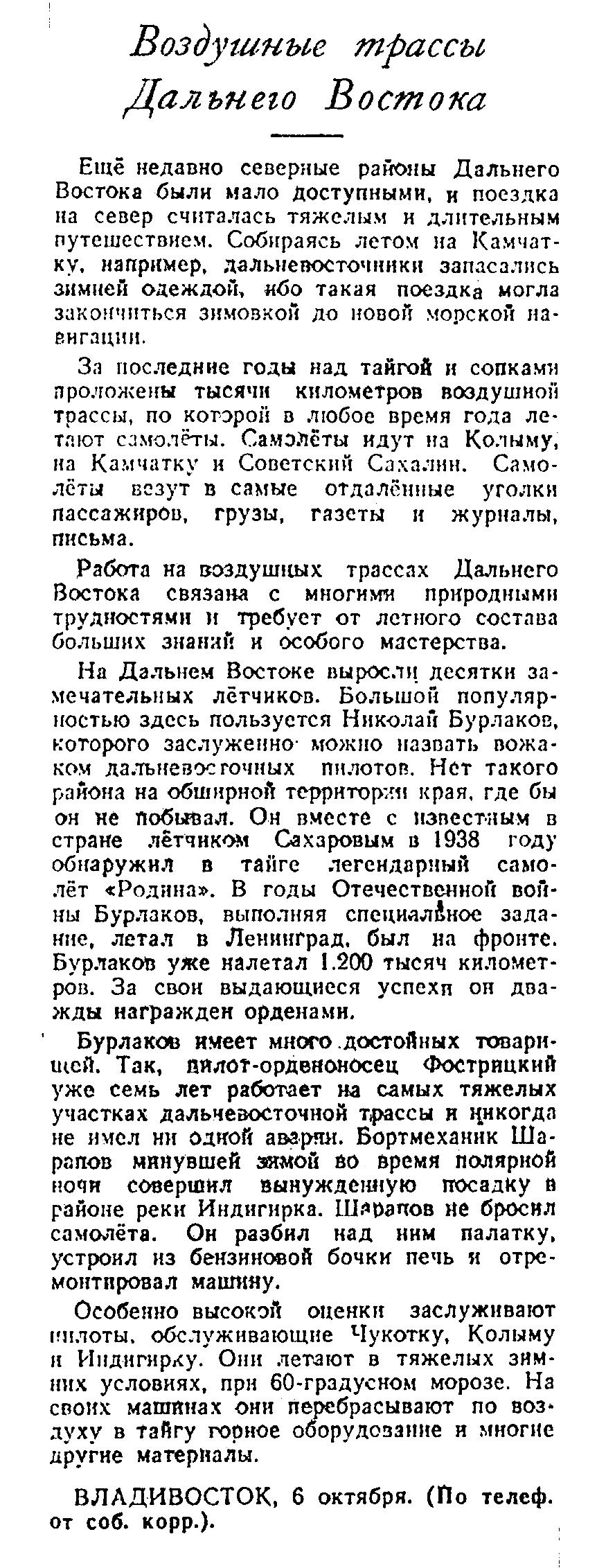 На Дальнем Востоке выросли, десятки замечательных лётчиков. Большой популярностью здесь пользуется Николай Бурлаков, которого заслуженно можно назвать вожаком дальневосточных пилотов. Нет такого района на обширной территории края, где бы он не побывал. Он вместе с известным в стране летчиком Сахаровым в 1938 году обнаружил в тайге легендарный самолёт «Родина». В годы Отечественной войны Бурлаков, выполняя специальное задание, летал в Ленинград, был на фронте. Бурлаков уже налетал 1.200 тысяч километров. За свои выдающиеся успехи он дважды награжден орденами.