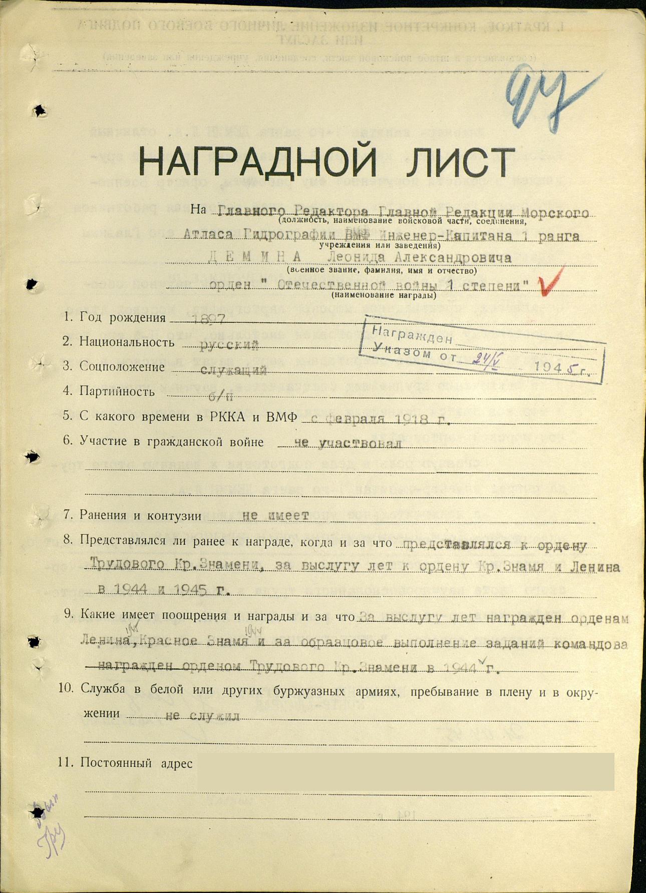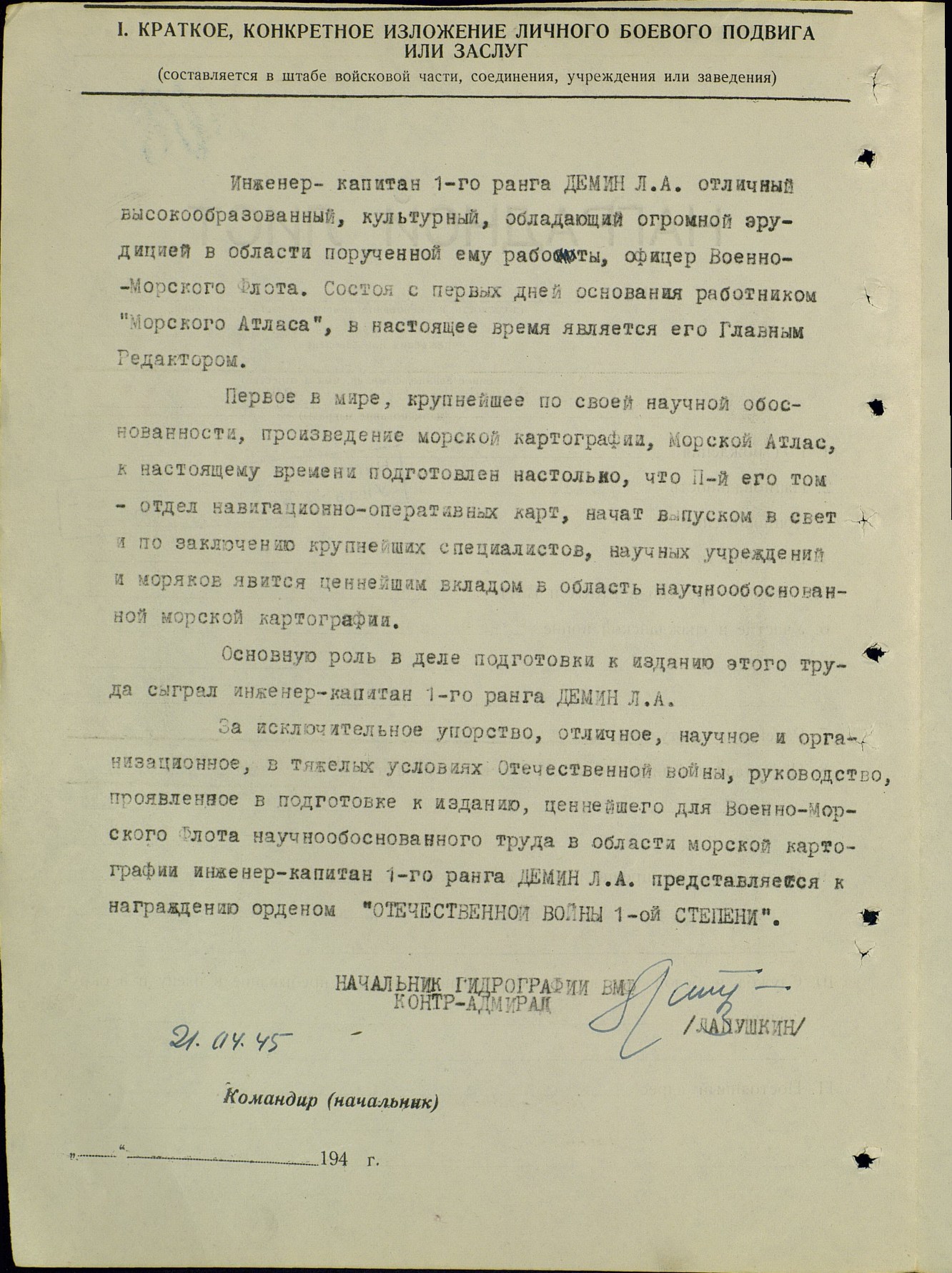 Вернувшись с Дальнего Востока, дед служил в Центральной Гидрографии. В войну ее эвакуировали из Ленинграда в Омск, где и создавали карту. «Атлас океана», 5 томов — это его основной труд. Подготовкой занималась отдельная воинская часть. Ответственный редактор – Главнокомандующий Морским флотом, дед был исполнительным редактором.