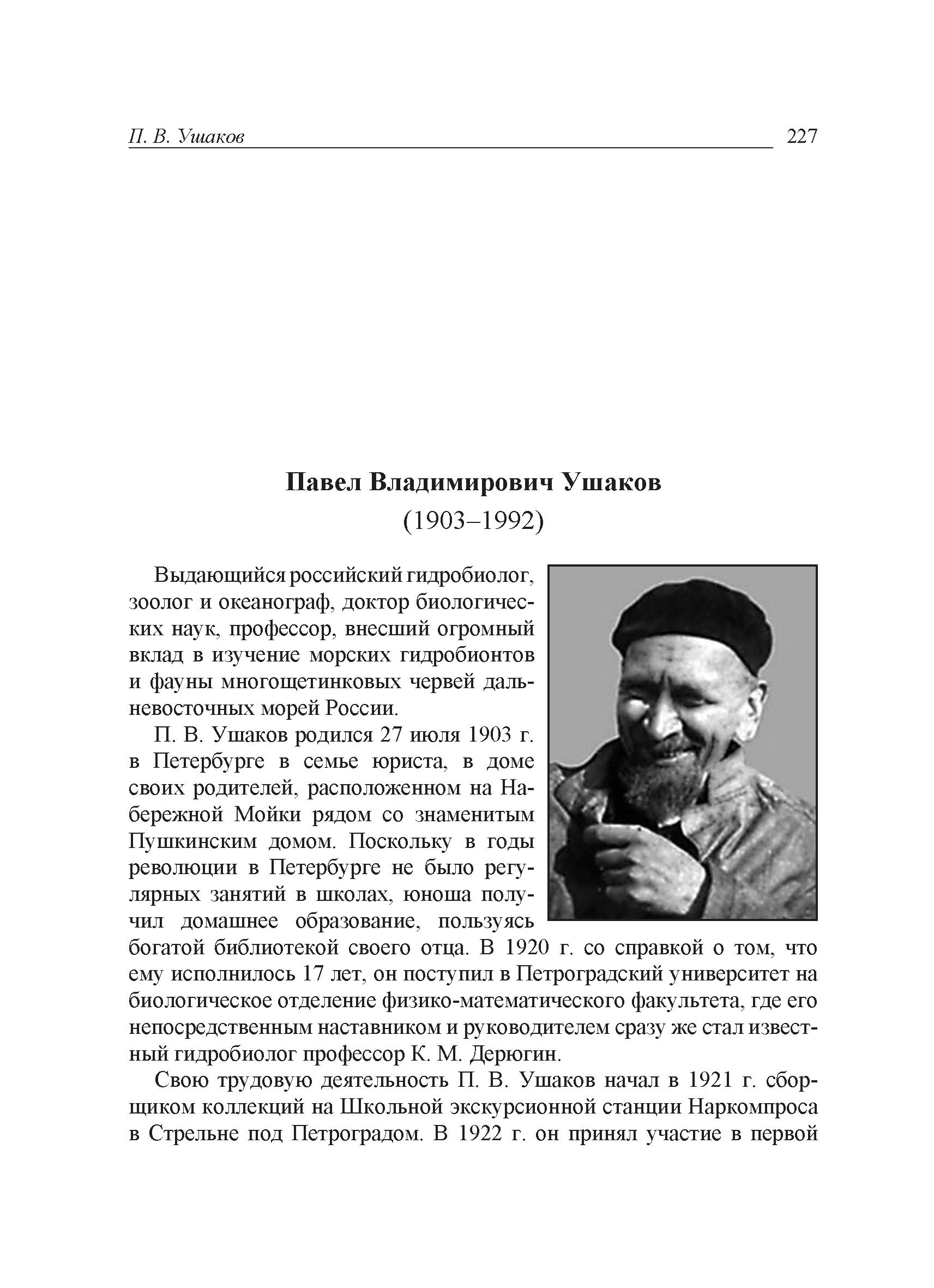 в противном случае грозя привлечь внимание к «непролетарскому» происхождению ученого. Поэтому с 1939 по 1943 г. П. В. Ушаков - старший научный сотрудник, а с 1943 по 1945 г. - начальник отделения Государственного океанографического института. В годы Великой Отечественной войны инженер-майор флота П. В. Ушаков издавал и редактировал «Гидрологические справочники» и ряд других гидрометеорологических пособий для военно-морского флота. Сразу после окончания войны в 1945 г. он перешел в Зоологический институт Академии наук, в котором проработал в течение 40 лет, заведуя лабораторией морских исследований и отделением по изучению группы высших червей.
