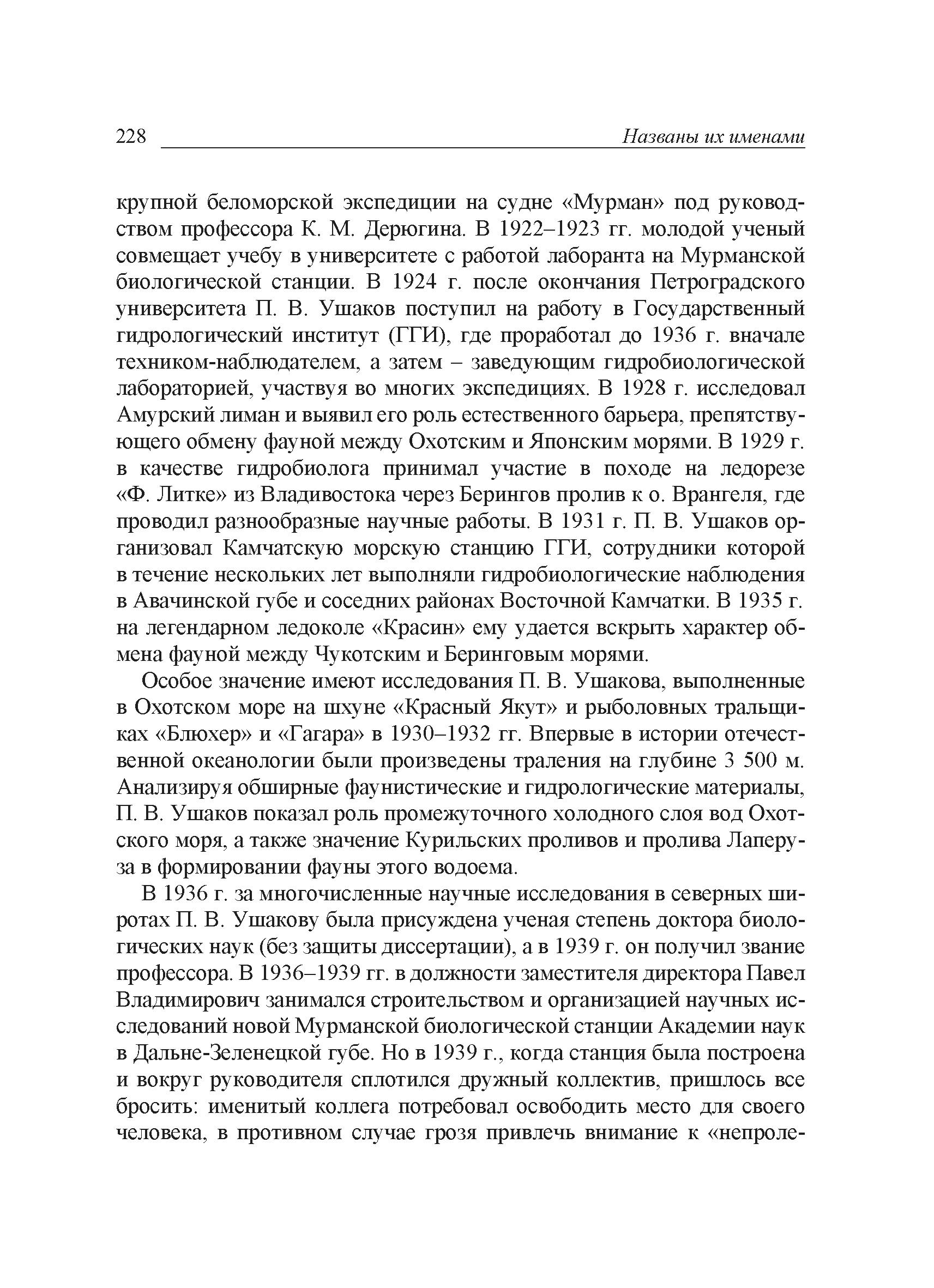 крупной беломорской экспедиции на судне «Мурман» под руководством профессора К. М. Дерюгина. В 1922-1923 гг. молодой ученый совмещает учебу в университете с работой лаборанта на Мурманской биологической станции. В 1924 г. после окончания Петроградского университета П. В. Ушаков поступил на работу в Государственный гидрологический институт (ГГИ), где проработал до 1936 г. вначале техником-наблюдателем, а затем - заведующим гидробиологической лабораторией, участвуя во многих экспедициях. В 1928 г. исследовал Амурский лиман и выявил его роль естественного барьера, препятствующего обмену фауной между Охотским и Японским морями. В 1929 г. в качестве гидробиолога принимал участие в походе на ледорезе «Ф. Литке» из Владивостока через Берингов пролив к о. Врангеля, где проводил разнообразные научные работы. В 1931 г. П. В. Ушаков организовал Камчатскую морскую станцию ГГИ, сотрудники которой в течение нескольких лет выполняли гидробиологические наблюдения в Авачинской губе и соседних районах Восточной Камчатки. В 1935 г. на легендарном ледоколе «Красин» ему удается вскрыть характер обмена фауной между Чукотским и Беринговым морями.