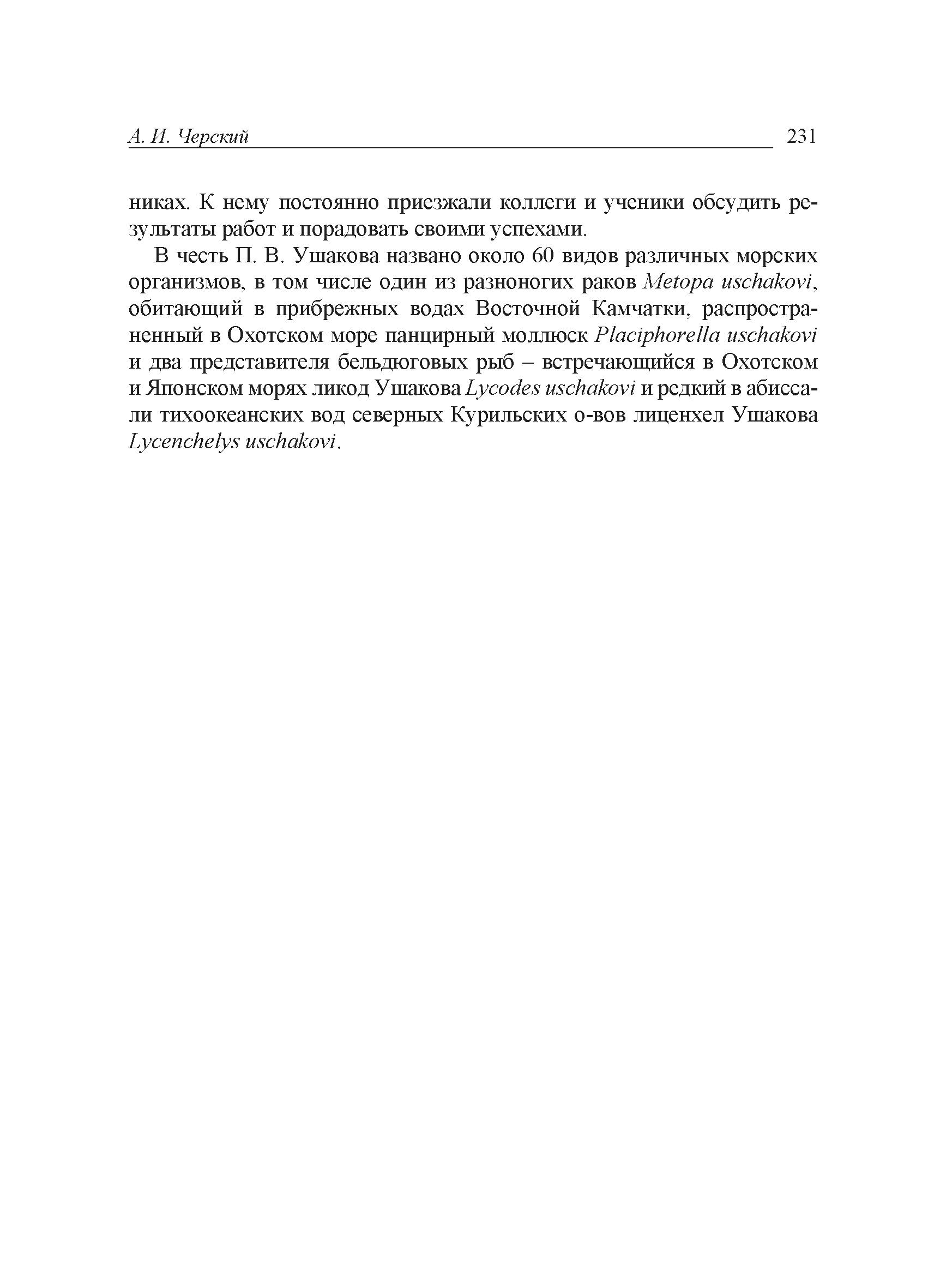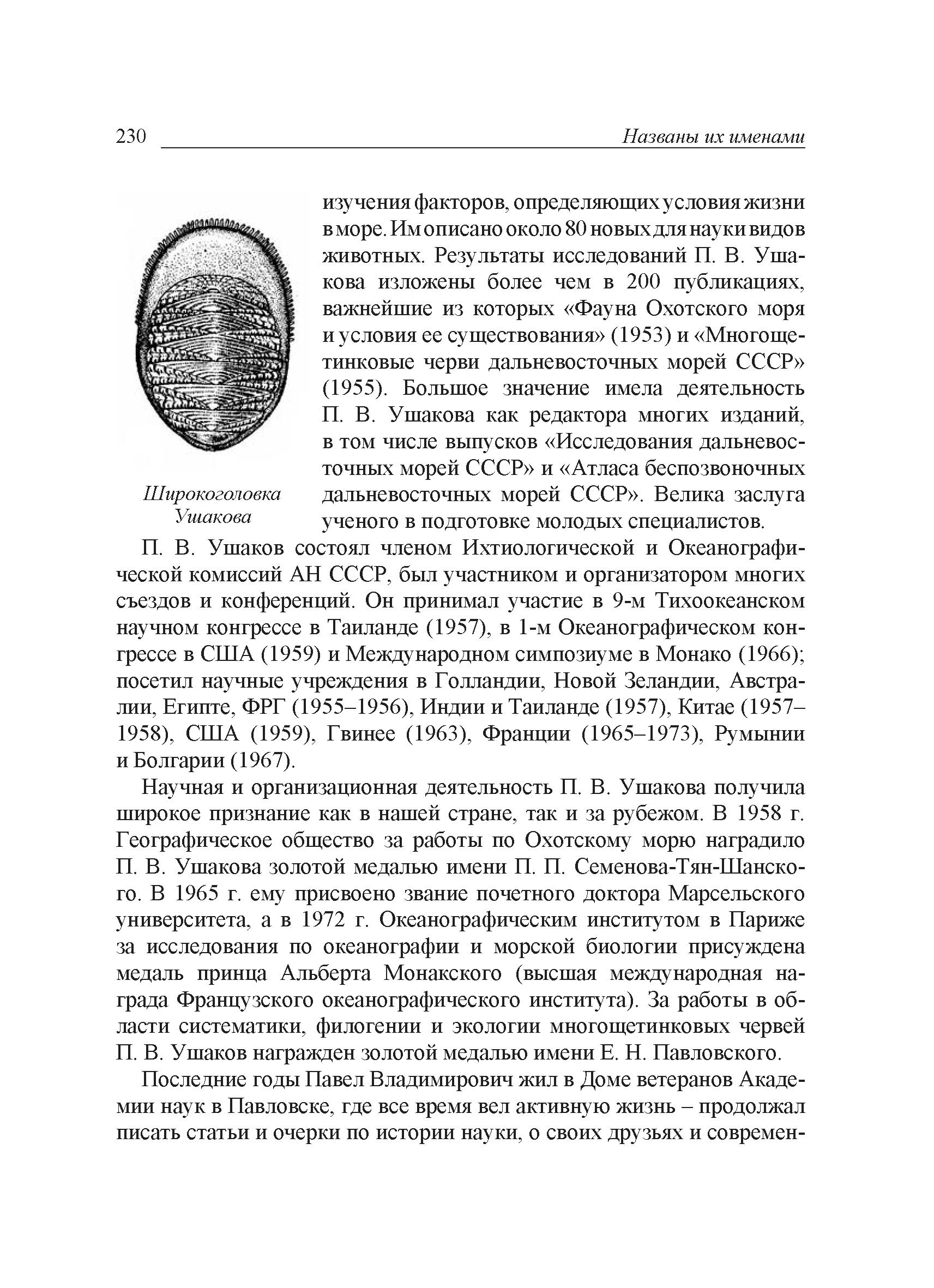 изучения факторов, определяющих условия жизни в море. Им описано около 80 новых для науки видов животных. Результаты исследований П. В. Ушакова изложены более чем в 200 публикациях, важнейшие из которых «Фауна Охотского моря и условия ее существования» (1953) и «Многощетинковые черви дальневосточных морей СССР» (1955). Большое значение имела деятельность П. В. Ушакова как редактора многих изданий, в том числе выпусков «Исследования дальневосточных морей СССР» и «Атласа беспозвоночных Широкоголовка дальневосточных морей СССР». Велика заслуга Ушакова ученого в подготовке молодых специалистов.