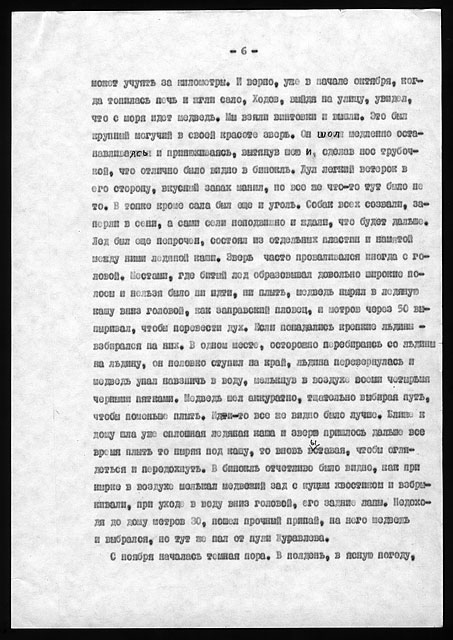 Этого типа дом был весьма удобен для жилья и очень тепел. За весь период двухгодичной зимовки заслонка печной трубы ни разу не закрывалась даже на ночь, из соображений вентиляции. Форточка в кухне бывала открыта целыми часами, да нередко и выходная дверь, и все же температура утром в доме никогда не падала ниже +8° в самые сильные морозы и пурги.