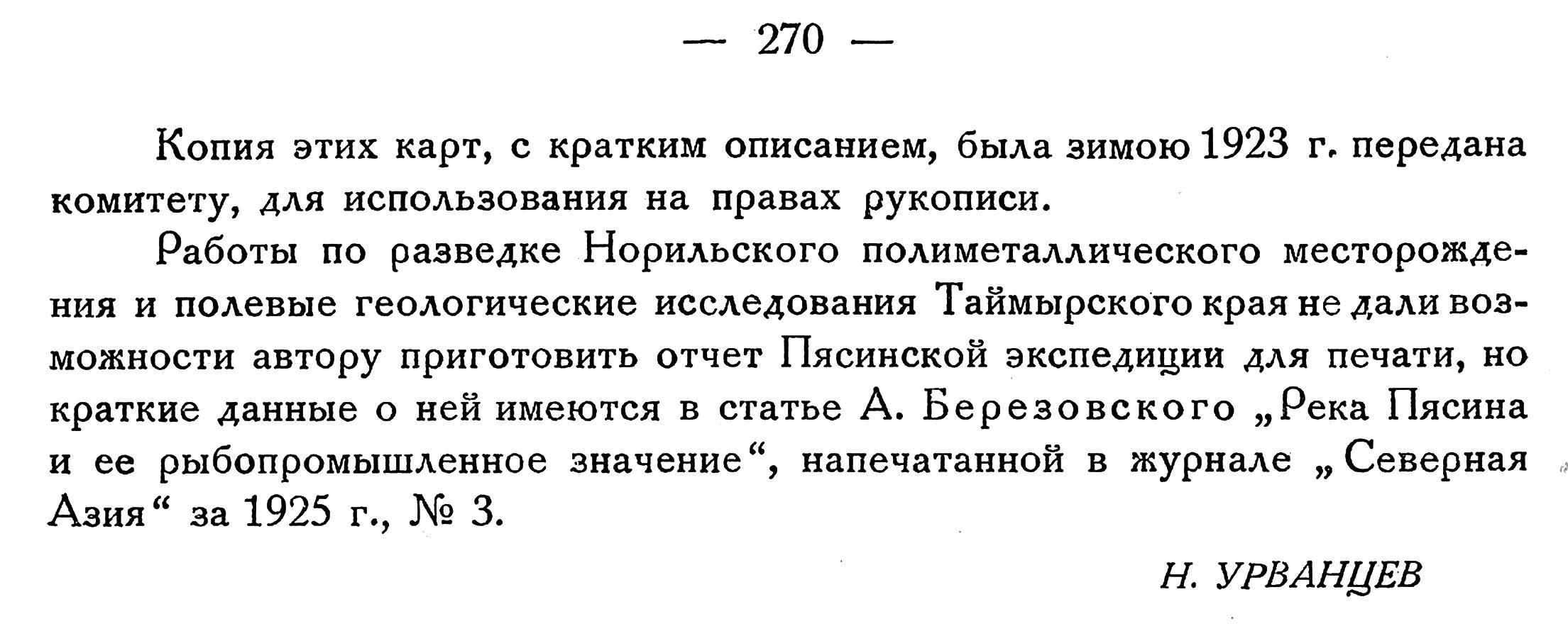 Работы по разведке Норильского полиметаллического месторождения и полевые геологические исследования Таймырского края не дали возможности автору приготовить отчет Пясинской экспедиции для печати, но краткие данные о ней имеются в статье А. Березовского „Река Пясина и ее рыбопромышленное значение", напечатанной в журнале „Северная Азия" за 1925 г., № 3.