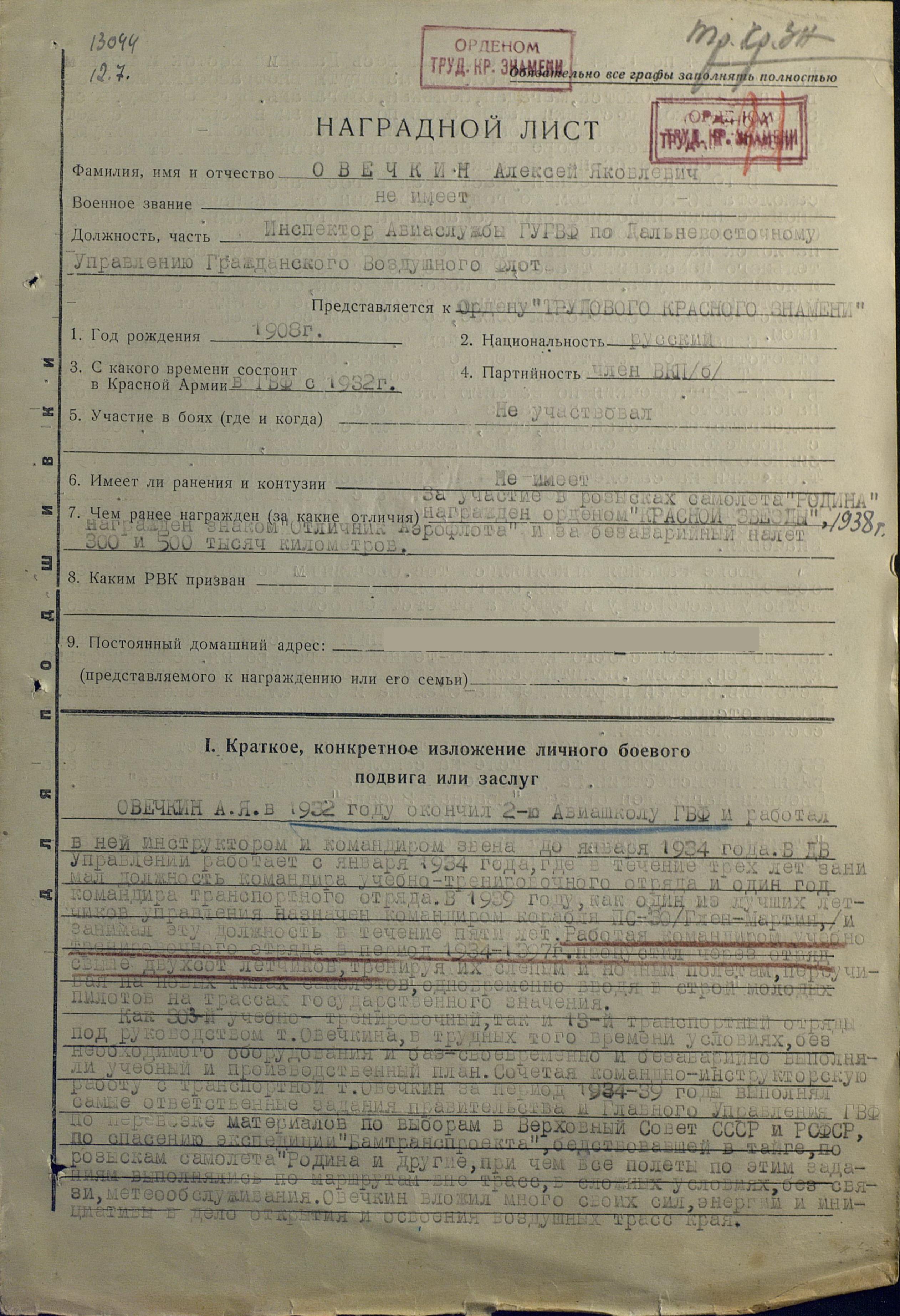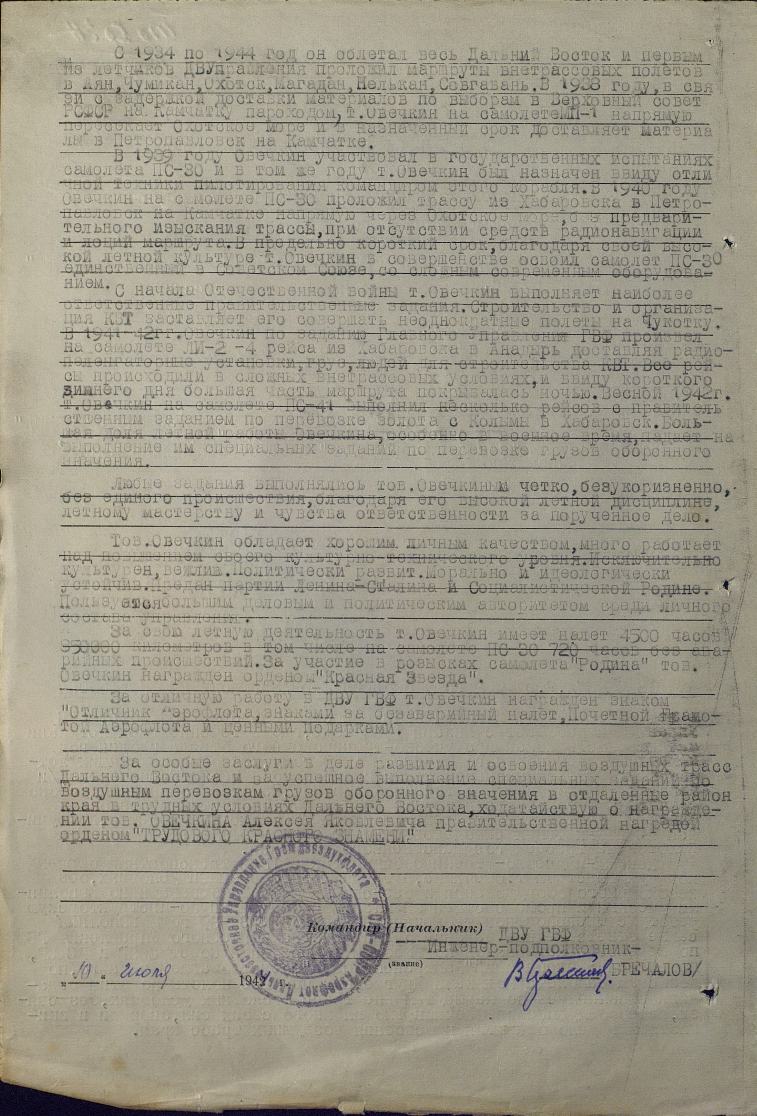 За особые заслуги в деле развития и освоения воздушных трасс Дальнего Востока и за успешное выполнение специальных заданий по воздушным перевозкам грузов оборонного значения в отдаленные районы края в трудных условиях Дальнего Востока, ходатайствую о награждении тов. Овечкина Алексея Яковлевича правительственной наградой орденом "ТРУДОВОГО КРАСНОГО ЗНАМЕНИ".