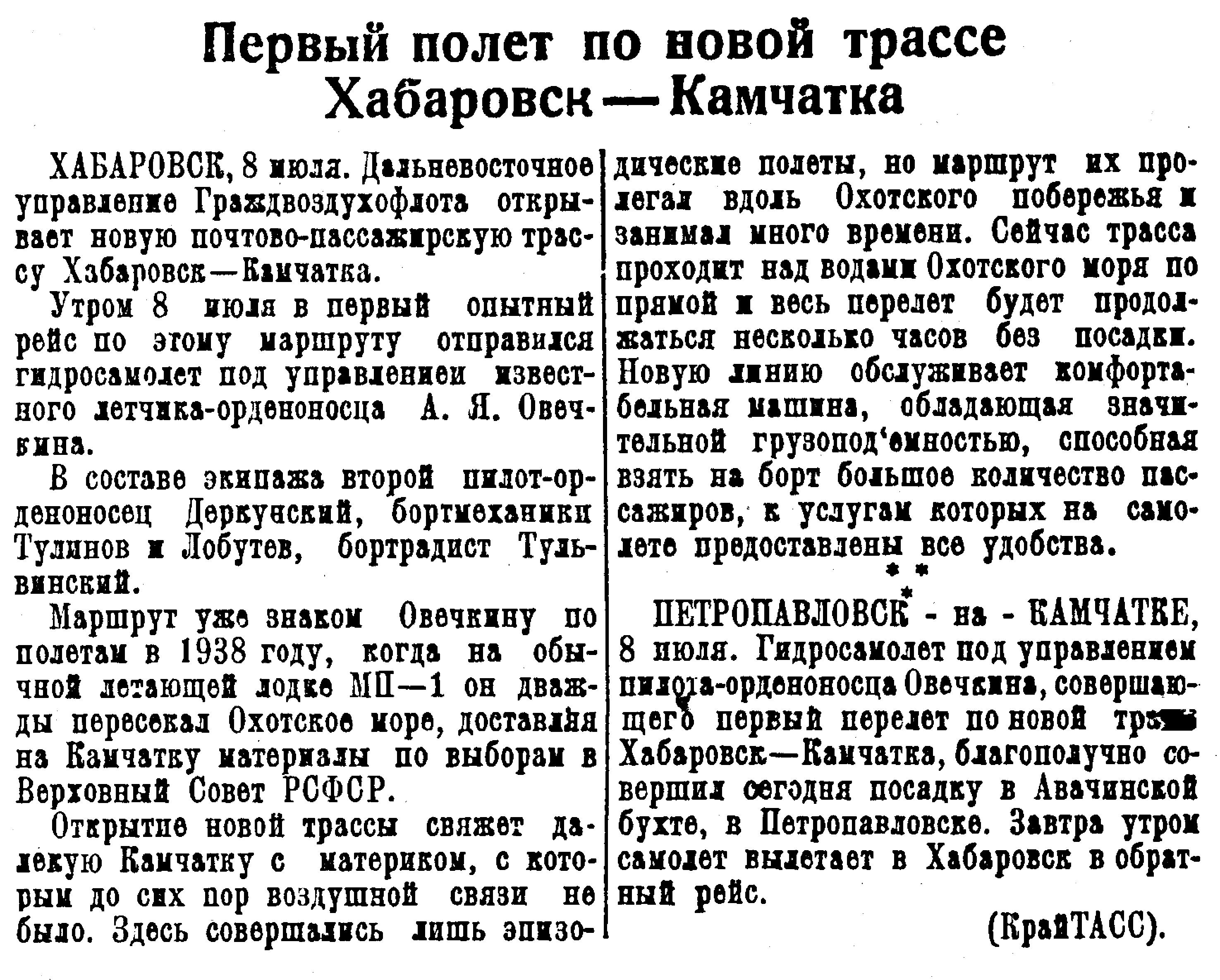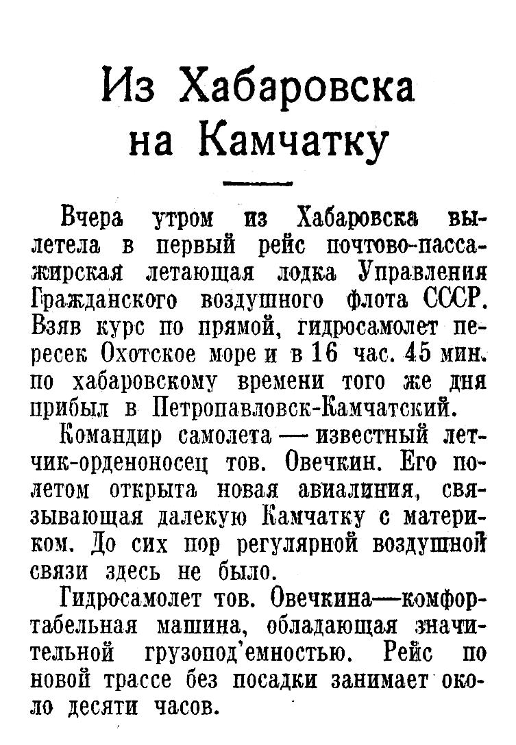 Вчера утром из Хабаровска вылетела в первый рейс почтово-пассажирская летающая лодка Управления Гражданского воздушного флота СССР. Взяв курс по прямой, гидросамолет пересек Охотское море и в 16 час. 45 мин. по хабаровскому времени того же дня прибыл в Петропавловск-Камчатский.