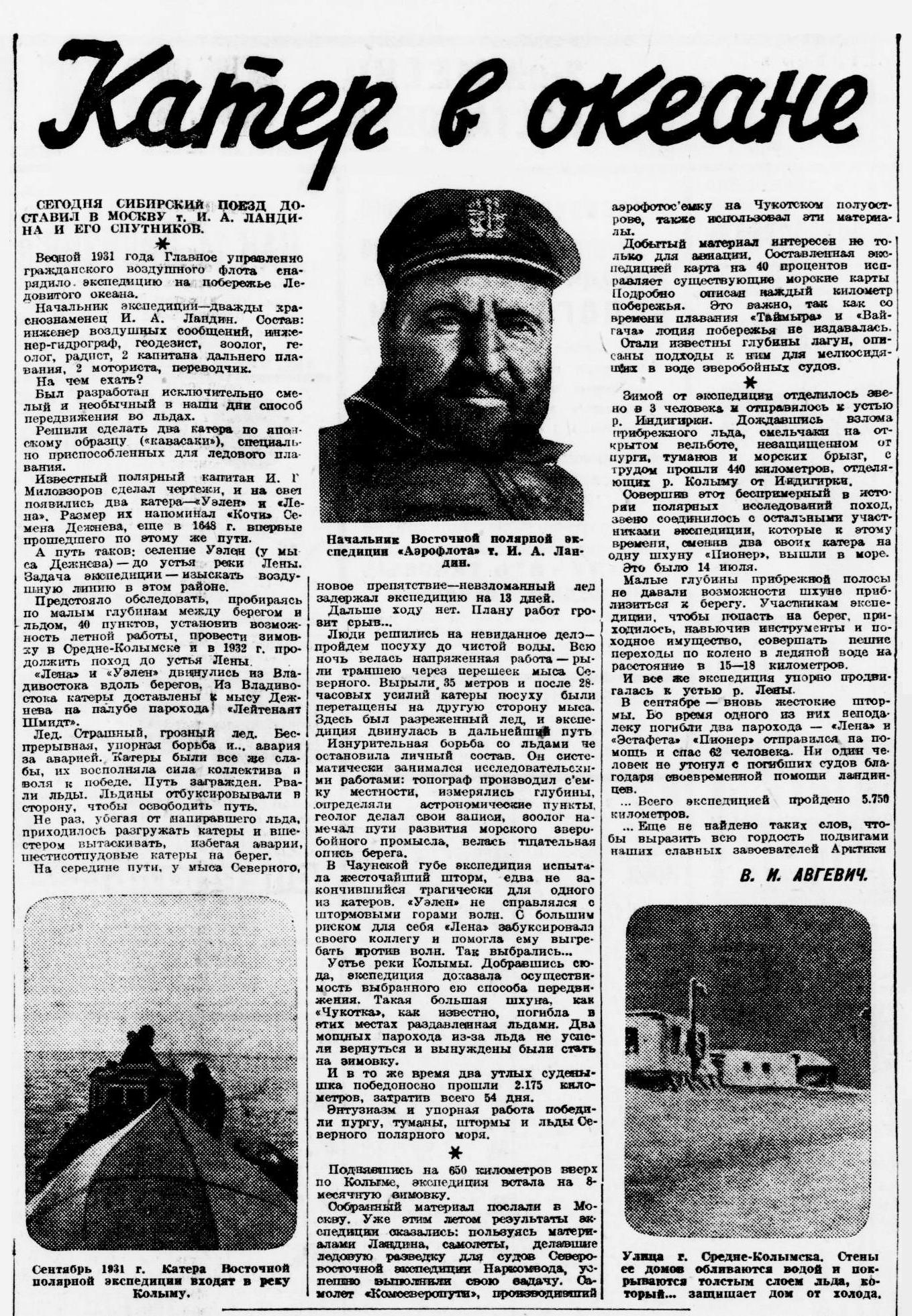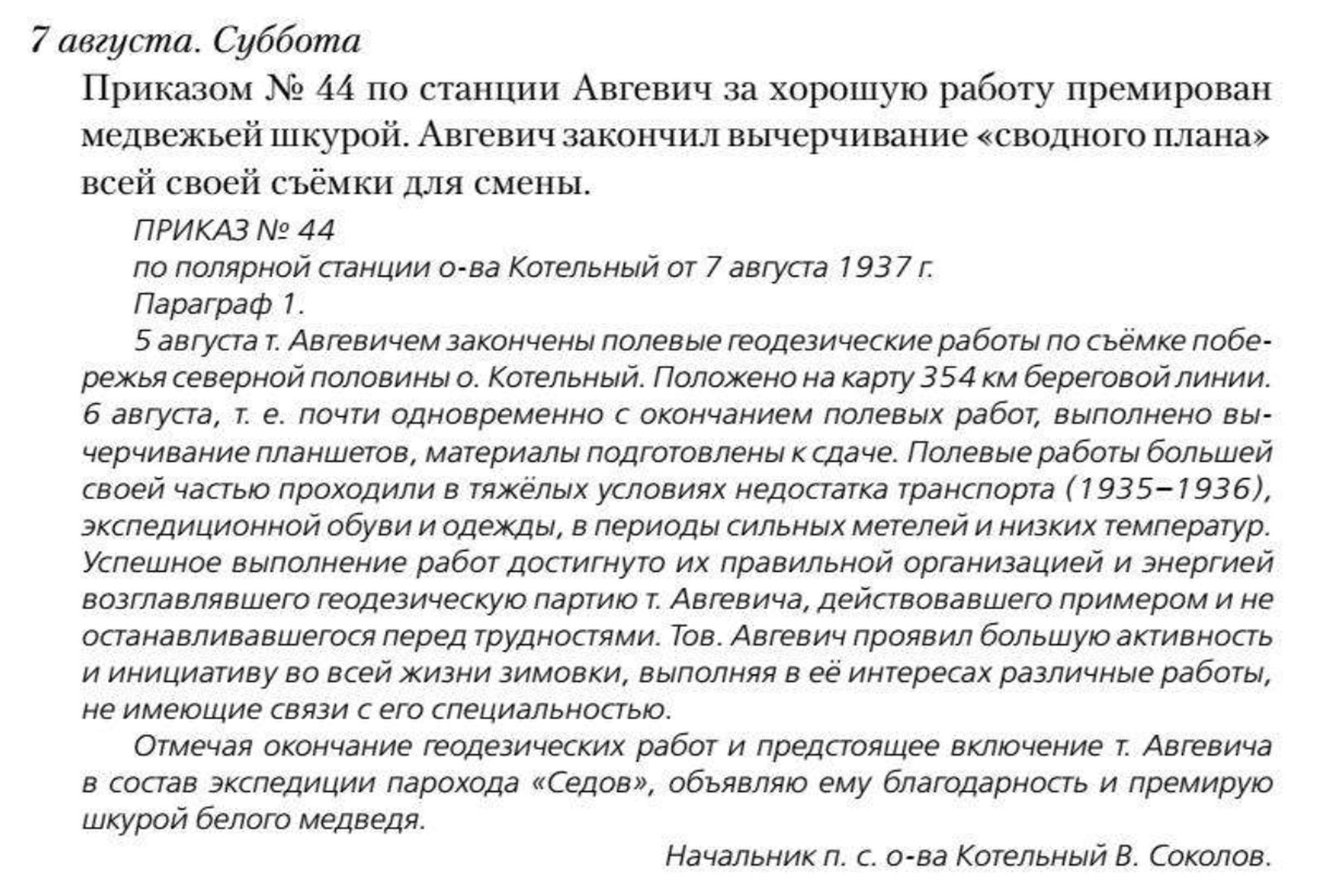 В приказе не назван помощник В. И. Авгевича по съемке острова Котельного каюр-якут З. З. Горохов — тогда этот значок считался ведомственной наградой и им награждались лишь работники Главсевморпути. Они выполнили 475 километров съемки побережья. Спешивший для поступления в Московский институт инженеров геодезии, аэросъемки и картографии Авгевич сел на «Г. Седов» и оказался на зимовке во льдах. Весной 1938 года он уже как пассажир самолета снова прибыл на станцию. Этот интереснейший человек до зимовки на Котельном три года работал в экспедиции И. А. Ландина на «Пионере» и много сделал для картографирования Восточного сектора Арктики, а имя его оказалось увековеченным на западе Таймыра в названии небольшой бухточки Витольда.