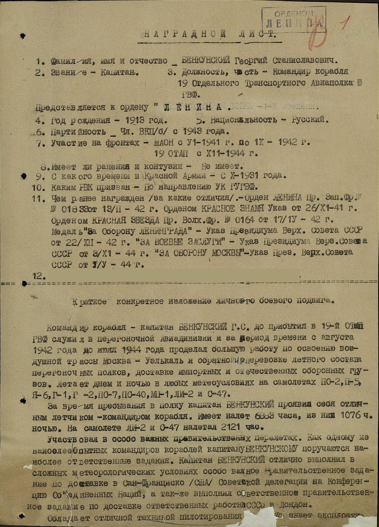 Г. БЕНКУНСКИЙ, заслуженный пилот СССР, ветеран Аэрофлота