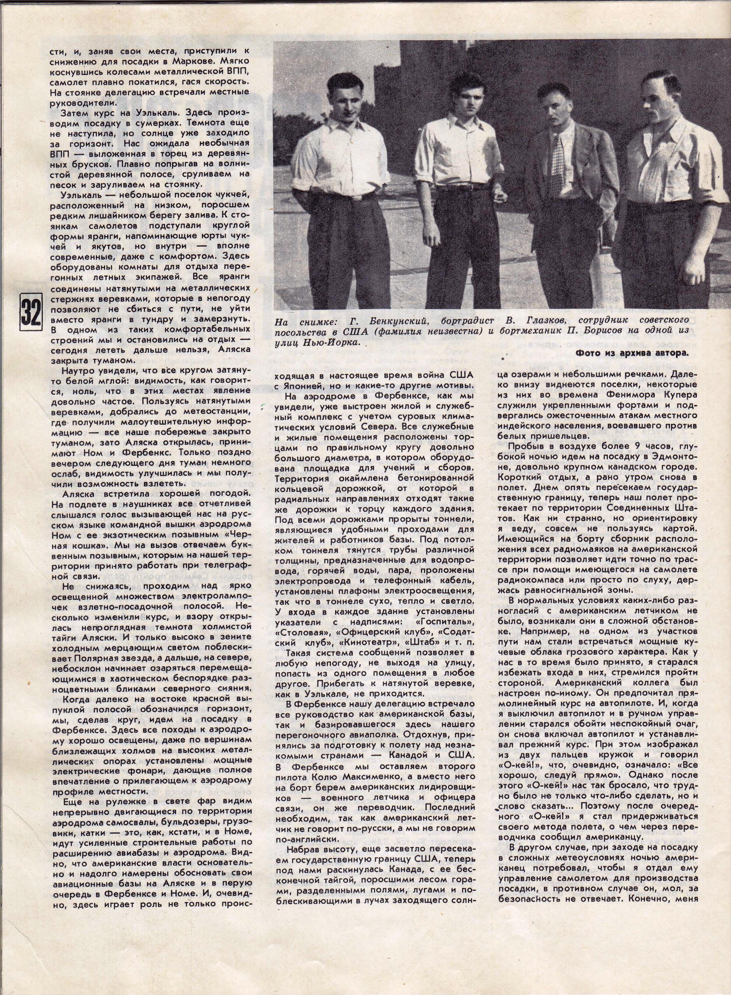 Нам из самолета было очень приятно наблюдать, с какими почестями встречали советских представителей на американской земле. После церемонии наша делегация на больших черных лимузинах в сопровождении эскорта полицейских мотоциклов под вой сирен направилась в город. Мы же, завершив все формальности, только вечером попали в гостиницу, где прежде всего отоспались. Через несколько дней новое задание, предстояло лететь в Фербенкс, чтобы доставить оттуда советскую торговую делегацию в Мандриал, после чего вернуться в Вашингтон. В этом полете и произошел отказ одного мотора, в результате которого состоялся официальный разговор с американским лидировщиком.