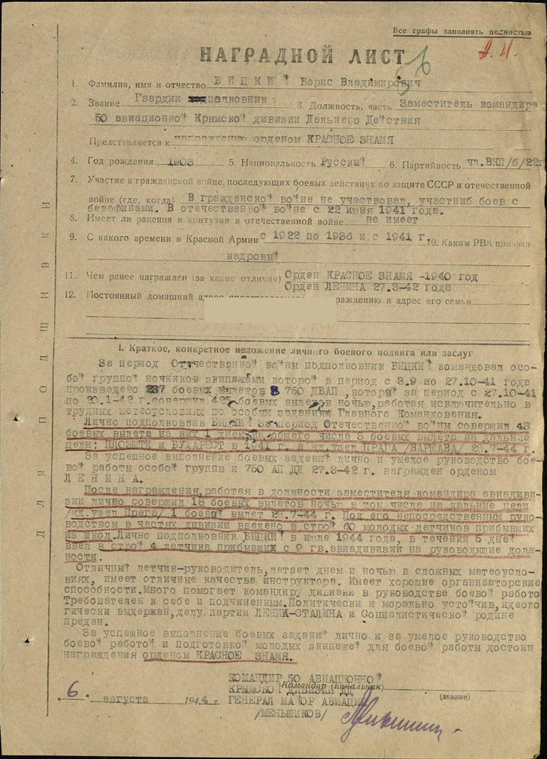 В 1944 – заместитель командира 50 Крымской авиационной дивизии Дальнего Действия (аддд).