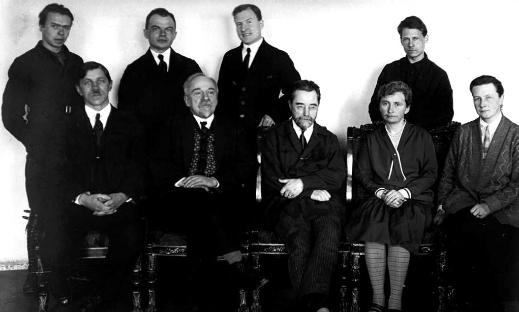 Орнитологи, 1924. Сидят, слева направо: П. В. Серебровский, П. П. Сушкин, А. Я. Тугаринов, Н. Н. Сушкина, Е. В. Козлова.