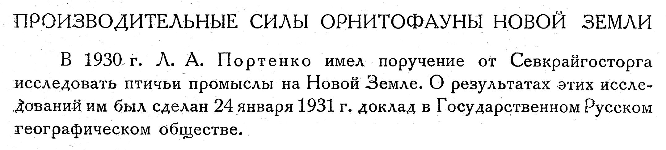 В 1930. г. Л. А. Портенко имел поручение от Севкрайгосторга исследовать птичьи промыслы на Новой Земле. О результатах этих исследований им был сделан 24 января 1931 г. доклад в Государственном Русском географическом обществе.