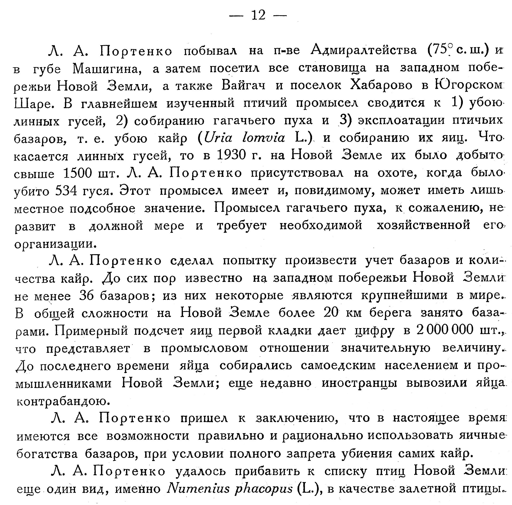 Л. А. Портенко побывал на п-ве Адмиралтейства (75°c. ш.) к в губе Машигина, а затем посетил все становища на западном побережьи Новой Земли, а также Вайгач и поселок Хабарово в Югорском Шаре. В главнейшем изученный птичий промысел сводится к 1) убою линных гусей, 2) собиранию гагачьего пуха и 3) эксплоатации птичьих базаров, т. е. убою кайр (Uria lomvia L.) и собиранию их яиц. Что касается линных гусей, то в 1930 г. на Новой Земле их было добыто свыше 1500 шт. Л. А. Портенко присутствовал на охоте, когда былоубито 534 гуся. Этот промысел имеет и, повидимому, может иметь лишь местное подсобное значение. Промысел гагачьего пуха, к сожалению, не развит в должной мере и требует необходимой хозяйственной его организации.