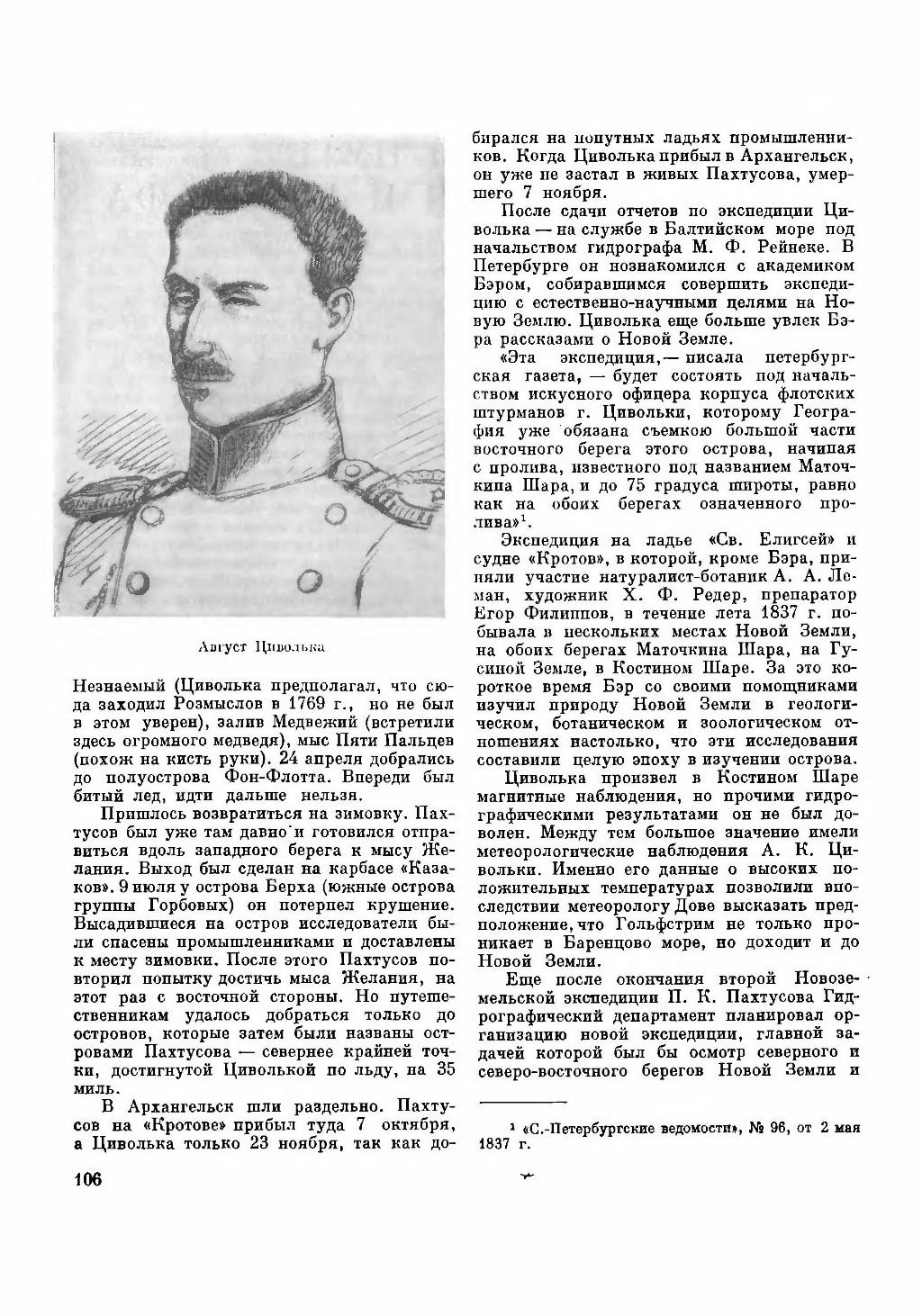 {1} Материалы о жизни и деятельности Цивольки можно найти лишь в воспоминаниях К. М. Бэра и статье В. Ю. Визе («Проблемы Арктики», 1939, № 2).{2} Дневные записки, веденный подпоручиком Пахтусовым, при описи восточного берега Новой Земли в 1834 и 1835 годах. «Записки Гидрографического департамента», ч. 2, СПб, 1844, стр. 41.[105]