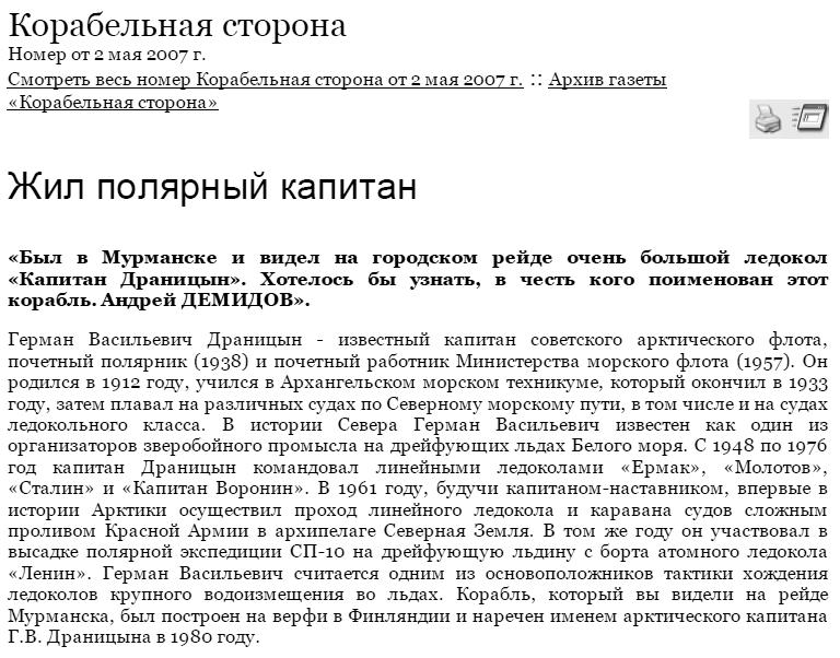 В честь него в 1980 г. назван ледокол "Капитан Драницын" - см. тему - viewtopic.php?t=899