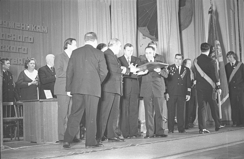 Драницын Г.В. (слева от знаменосца) на церемонии торжественного вручения памятного адреса по случаю награждения Мурманского морского пароходства орденом Трудового Красного Знамени. Слева-направо: Птицын В.Н., Игнатюк В.А., Селитов Е.В., Шашков В.Я. Мурманск, май 1976 г. // Из фондов ГОАУК "Мурманский областной краеведческий музей" - Госкаталог - https://goskatalog.ru/portal/#/collections?id=55575959