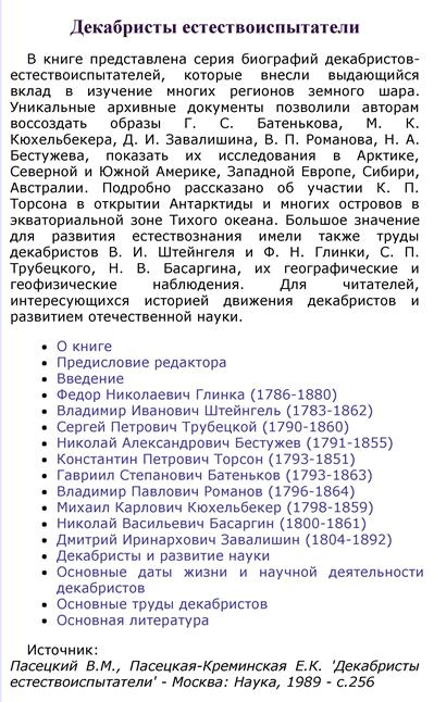 Пасецкий В.М., Пасецкая-Креминская Е.К. Декабристы естествоиспытатели. - Москва: Наука, 1989 - с.256