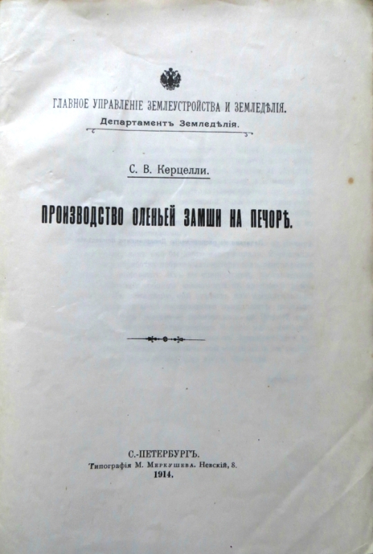 Керцелли С.В. Производство оленьей замши на Печоре. СПб. Типография М.Меркушева. 1914г. 34 с., ил.