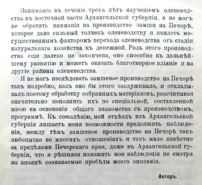 Занимаясь въ теченіе трехъ лѣтъ изученіемъ оленеводства въ восточной части Архангельской губерніи, я не могъ не обратить вниманія на производство замши на Печоре, которое дало сильный толчекъ оленеводству и явилось могущественнымъ факторомъ перехода оленеводства отъ стадіи натуральнаго хозяйства къ денежной. Роль этого производства еще далеко не закончена, оно способно къ дальнейшему развитію и можетъ оказать благотворное вліяніе и на другіе районы оленеводства.