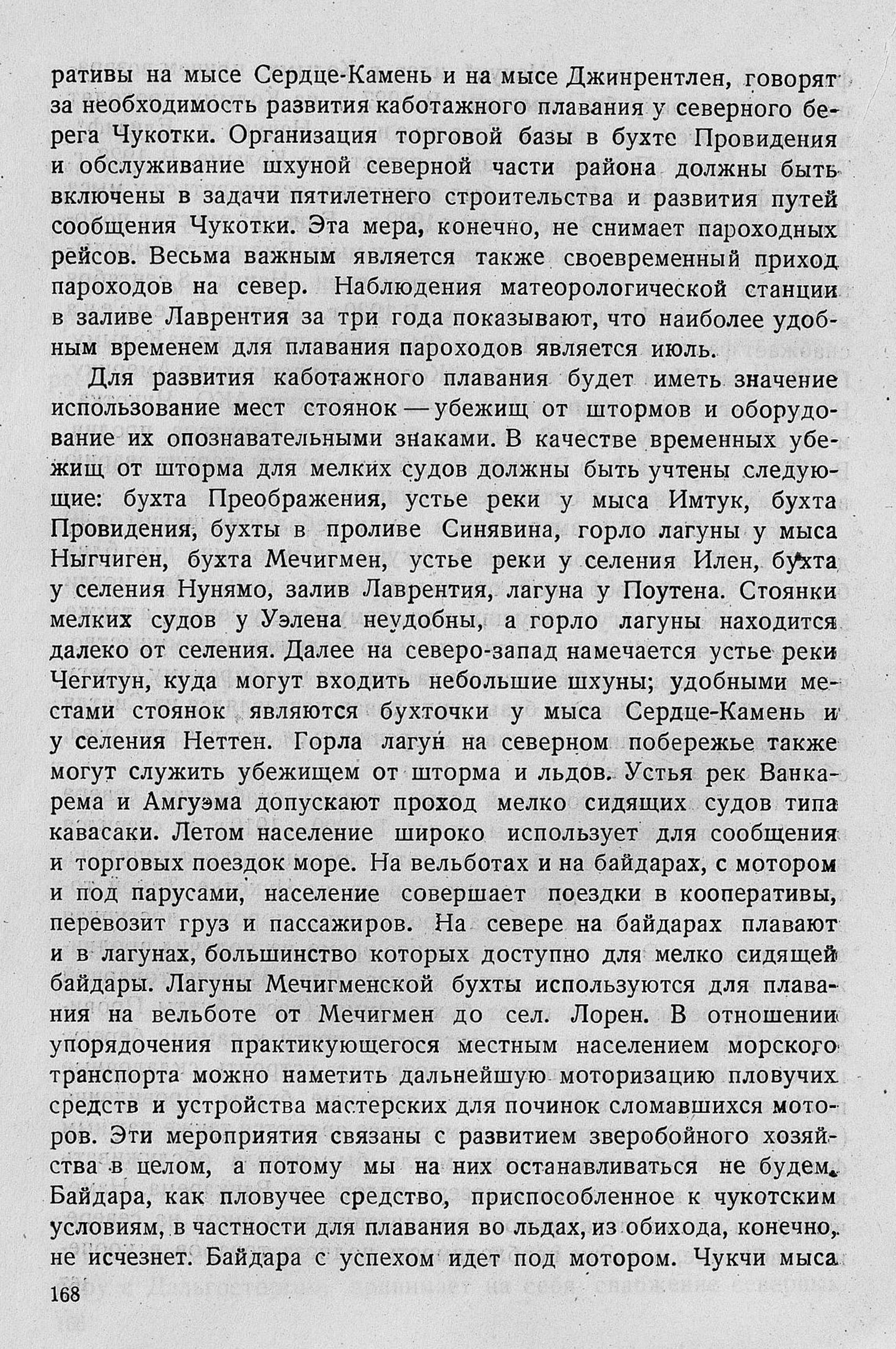 Для развития каботажного плавания будет иметь значение использование мест стоянок — убежищ от штормов и оборудование их опознавательными знаками. В качестве временных убежищ от шторма для мелких судов должны быть учтены следующие: бухта Преображения, устье реки у мыса Имтук, бухта Провидения, бухты в проливе Синявина, горло лагуны у мыса Ныгчиген, бухта Мечигмен, устье реки у селения Илен, бухта у селения Нунямо, залив Лаврентия, лагуна у Поутена. Стоянки мелких судов у Уэлена неудобны, а горло лагуны находится далеко от селения. Далее на северо-запад намечается устье реки Чегитун, куда могут входить небольшие шхуны; удобными местами стоянок являются бухточки у мыса Сердце-Камень и у селения Неттен. Горла лагун на северном побережье также могут служить убежищем от шторма и льдов. Устья рек Ванкарема и Амгуэма допускают проход мелко сидящих судов типа кавасаки. Летом население широко использует для сообщения и торговых поездок море. На вельботах и на байдарах, с мотором и под парусами, население совершает поездки в кооперативы, перевозит груз и пассажиров. На севере на байдарах плавают и в лагунах, большинство которых доступно для мелко сидящей байдары. Лагуны Мечигменской бухты используются для плавания на вельботе от Мечигмен до сел. Лорен. В отношении упорядочения практикующегося местным населением морского транспорта можно наметить дальнейшую моторизацию пловучих средств и устройства мастерских для починок сломавшихся моторов. Эти мероприятия связаны с развитием зверобойного хозяйства в целом, а потому мы на них останавливаться не будем. Байдара, как пловучее средство, приспособленное к чукотским условиям, в частности для плавания во льдах, из обихода, конечно, не исчезнет. Байдара с успехом идет под мотором. Чукчи мыса