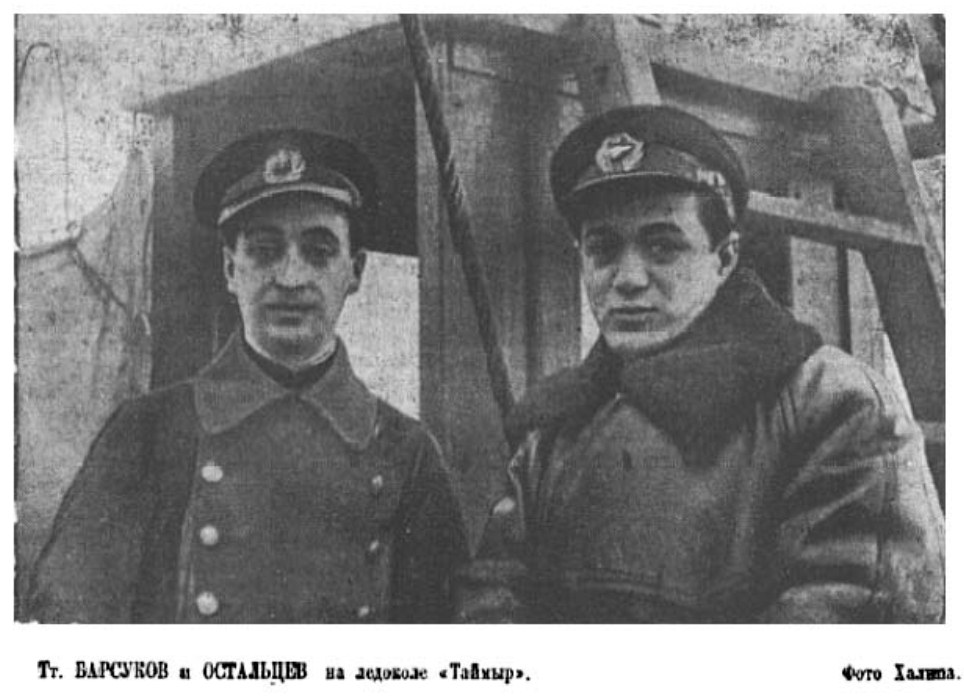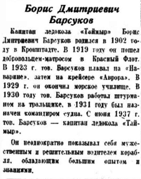 Капитан ледокола «Таймыр» Борис Дмитриевич Барсуков родился в 1902 году в Кронштадте. В 1919 год он пошел добровольцем-матросом в Красный Флот. В 1923 г. тов. Барсуков плавал на «Наварине», затем на крейсере «Аврора». В 1929 г. он окончил морское училище. В 1930 году тов. Барсуков работал штурманом на тральщике, в 1931 году был назначен командиром судна. С июня 1937 г. тов. Барсуков — капитан ледокола «Таймыр».