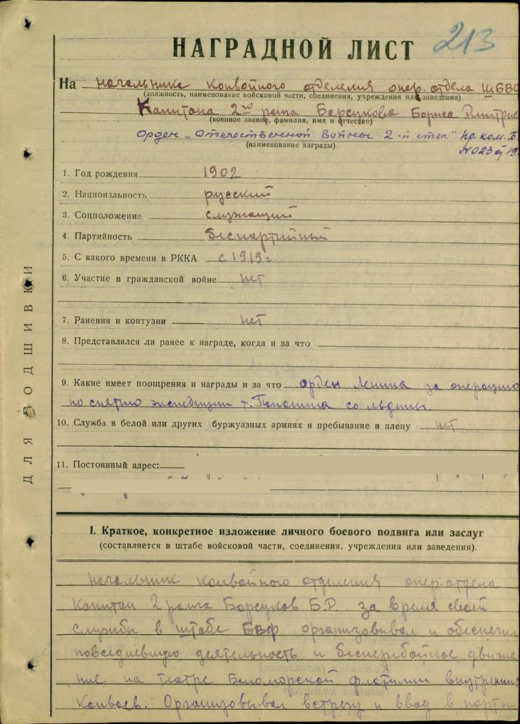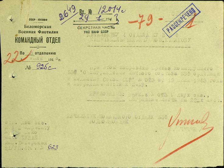 Представление на награждение № 23 от: 19.07.1943 БВФл