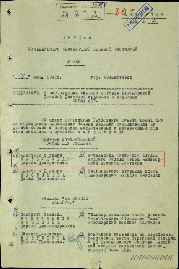 Приказ флота (флотилии) № 23 от: 19.07.1943 БВФл