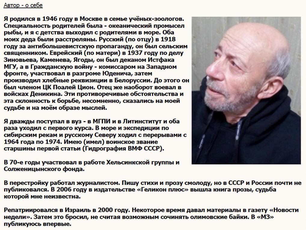 Репатриировался в Израиль в 2000 году. Некоторое время давал материалы в газету «Новости недели». Затем это бросил, не считая возможным сочинять олимовские байки. В «М3» публикуюсь впервые.