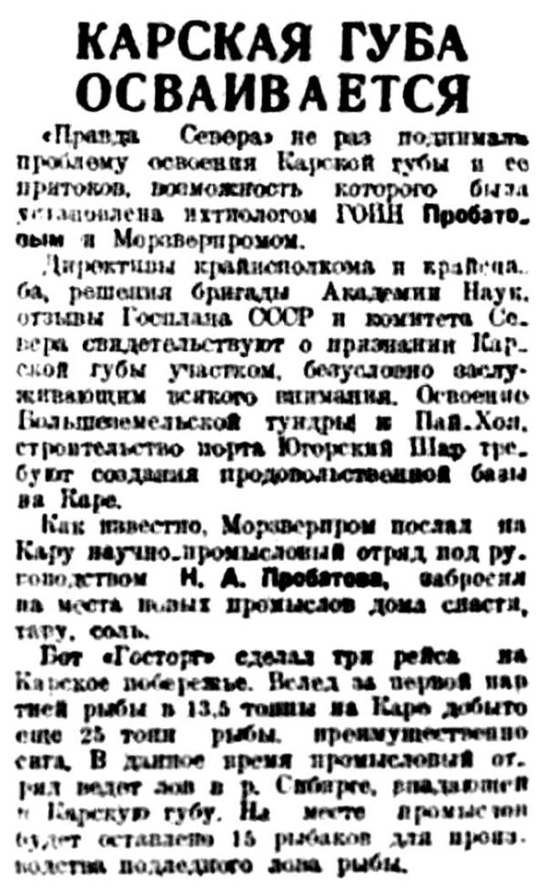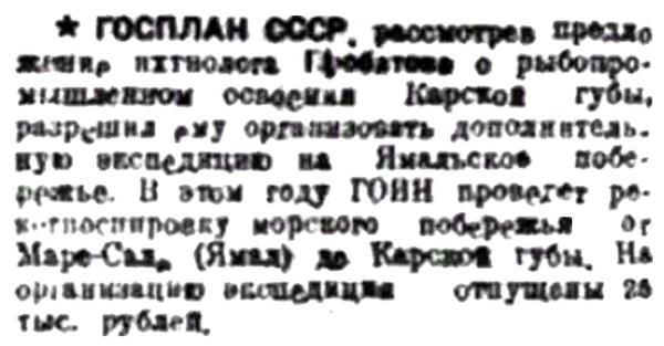 ГОСПЛАН СССР, рассмотрев предложение ихтиолога Пробатова о рыбопромышленном освоении Карской губы, разрешил ему организовать дополнительную экспедицию на Ямальское побережье. В этом году ГОИН проведет рекогносцировку морского побережья от Маре-Сале (Ямал) до Карской губы. На организацию экспедиции отпущены 25 тыс. рублей.