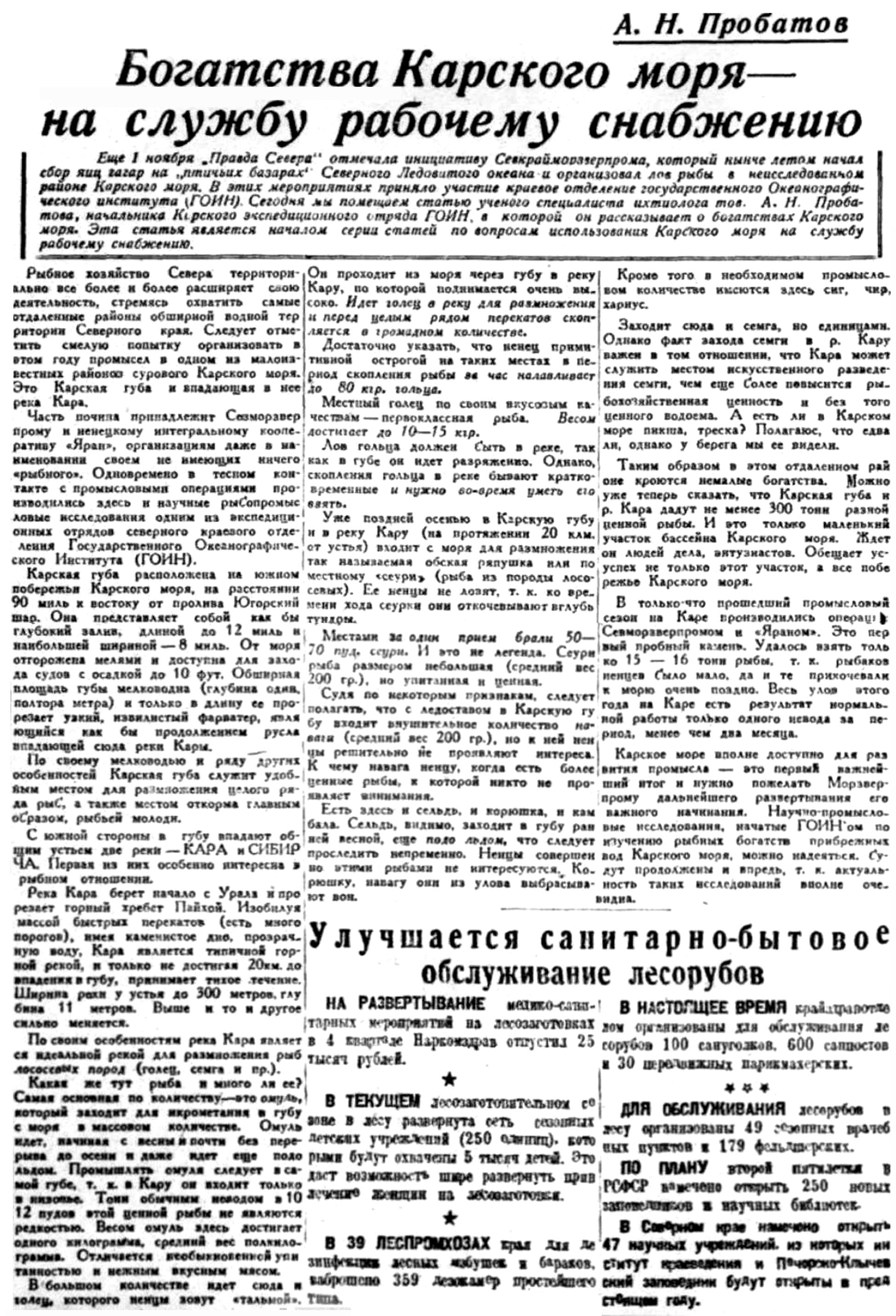 Еще 1 ноября "Правда Севера" отмечала инициативу Севкрайморзверпрома, который нынче летом начал сбор яиц гагар на птичьих базарах Северного Ледовитого океана и организовал лов рыбы в неисследованном районе Карского моря. В этих мероприятиях приняло участие краевое отделение государственного Океанографического института {ГОИН). Сегодня мы помещаем статью ученого специалиста ихтиолога тов. А. Н. Пробатова, начальника Карского экспедиционного отряда ГОИН. в которой он рассказывает о богатствах Карского моря. Эта статья является началом серии статей по вопросам использования Карского моря на службу рабочему снабжению.