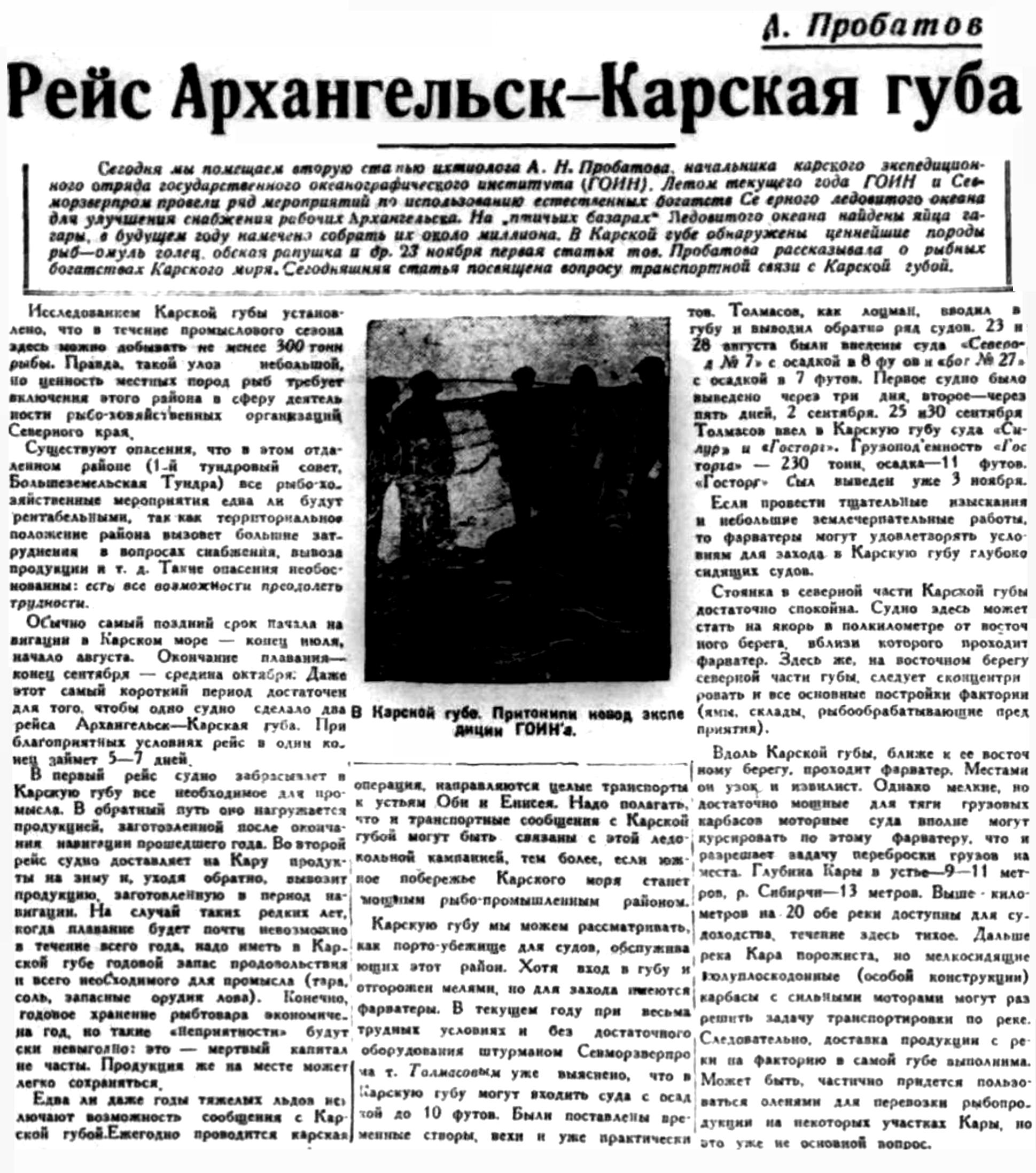 Сегодня мы помещаем вторую статью ихтиолога А. Н. Пробатова начальника карскою экспедиционного отряда государственного океанографическою института (ГОИН). Летом текущего года ГОИН и Севморзверпром провели рад мероприятий по использованию естественных богатств Северного ледовитого океана для улучшения снабжения рабочих Архангельска. На "птичьих базарах" Ледовитою океана найдены яйца гагары, в будущем году намечено собрать их около миллиона. В Карской губе обнаружены ценнейшие породы рыб — омуль, голец, обская ряпушка и др. 23 ноября первая статья тов. Пробатова рассказываю о рыбных богатствах Карского моря. Сегодняшняя статья посвящена вопросу транспортной связи с Карской губой.