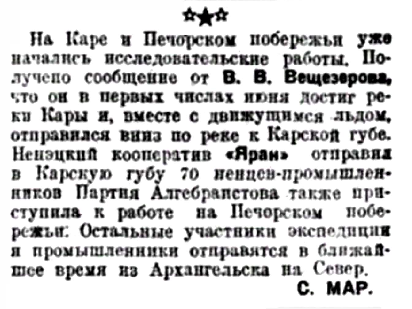 На Каре и Печорском побережьи уже начались исследовательские работы. Получено сообщение от В. В. Вещезерова, что он в первых числах июня достиг реки Кары и, вместе с движущимся льдом, отправился вниз по реке к Карской губе. Ненецкий кооператив "Яран" отправил в Карскую губу 70 ненцев-промышленников. Партия Алгебраистова также приступила к работе на Печорском побережьи. Остальные участники экспедиции и промышленники отправится в ближайшее время из Архангельска на Север.