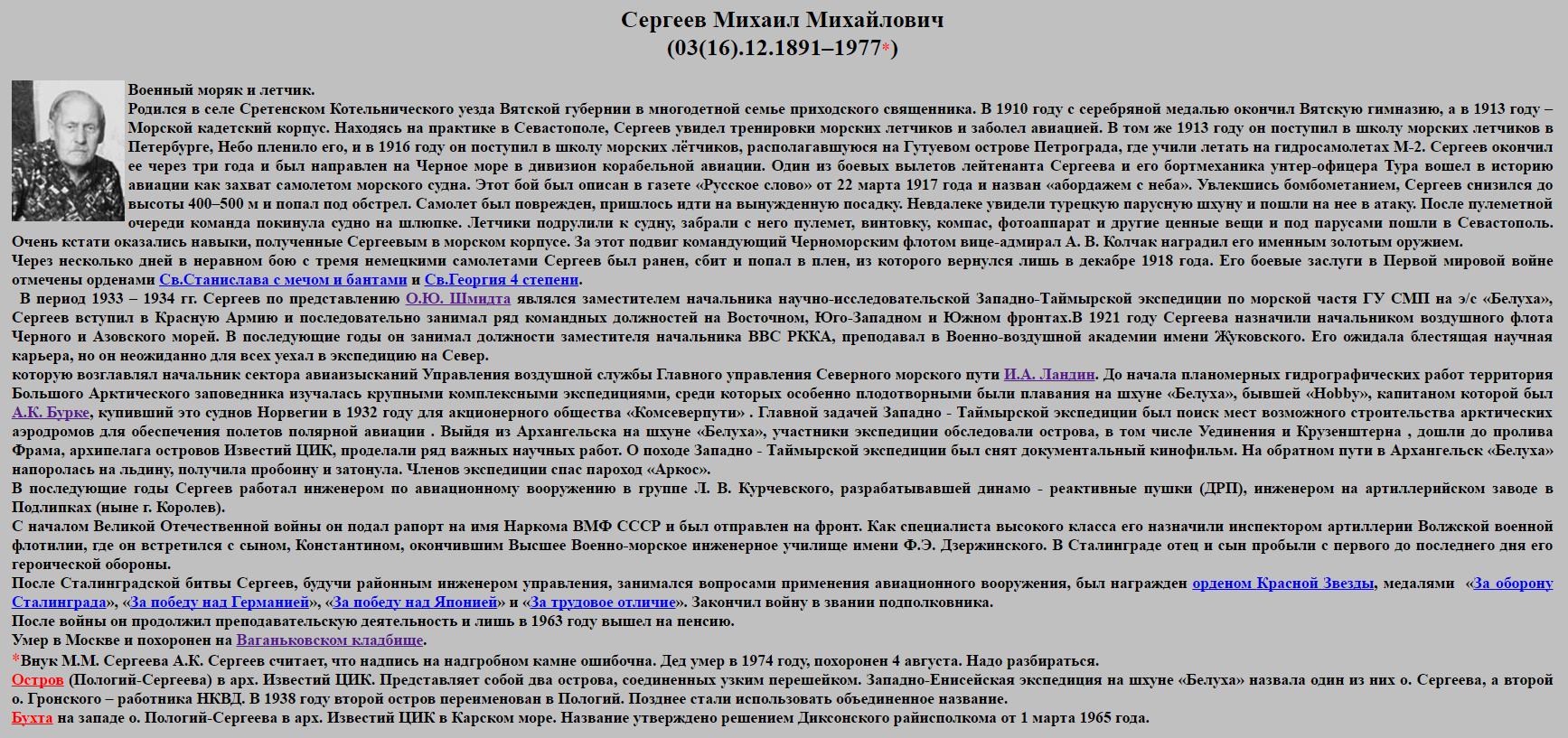 КРАТКАЯ БИОГРАФИЯ ПОДПОЛКОВНИКА АВИАЦИИ В ОТСТАВКЕ СЕРГЕЕВА МИХАИЛА МИХАЙЛОВИЧАРодился 3 (16) декабря 1891 года в селе Сретенском Котельнического уезда Вятской губернии (б. Вятка - теперь г. Киров обл.) в семье священника. По национальности - русский.