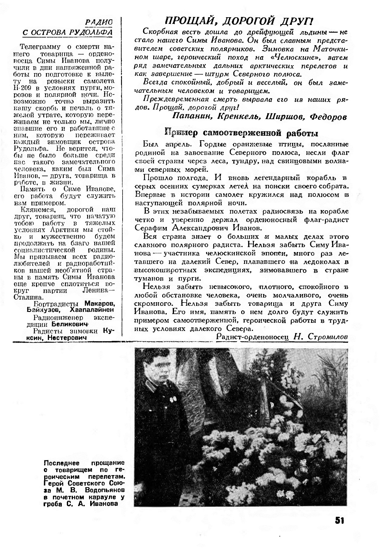 Проститься с Симой Ивановым пришли его друзья и товарищи по работе—полярники, радисты, летчики. В почетный караул встали Герои Советского Союза тт. Водопьянов и Спирин. Они особенно хорошо знали и ценили своего флаг-радиста, показавшего исключительное мастерство радиосвязи и в экспедиции на Северный полюс, и в воздушных операциях по розыскам самолета Н-209. Траурные знамена склонились над гробом радиста. Среди них — знамя от коллектива зимовщиков острова Рудольфа, где еще так недавно был и работал Серафим Иванов.