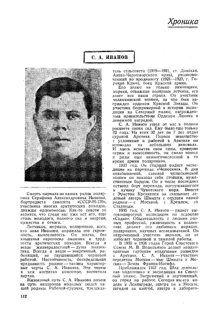 Совсем недавно мы отправляли его в новый путь. Он полетел бортрадистом па том же самолете "СССР-Н-170" под водительством М. В. Водопьянова на розыски самолета "Н-209" т. Леваневского. Вернувшись в Москву, он заболел гриппом. И вот 2 декабря тяжелое осложнение на почве гриппа навсегда от нас унесло т. Иванова. Тяжела утрата. Тем тяжелее ее переживаешь, когда чувствуешь, что этот молодой, жизнерадостный человек, имеющий прекрасный опыт работы в Арктике, еще многое мог бы дать в борьбе за освоение и изучение Арктики.