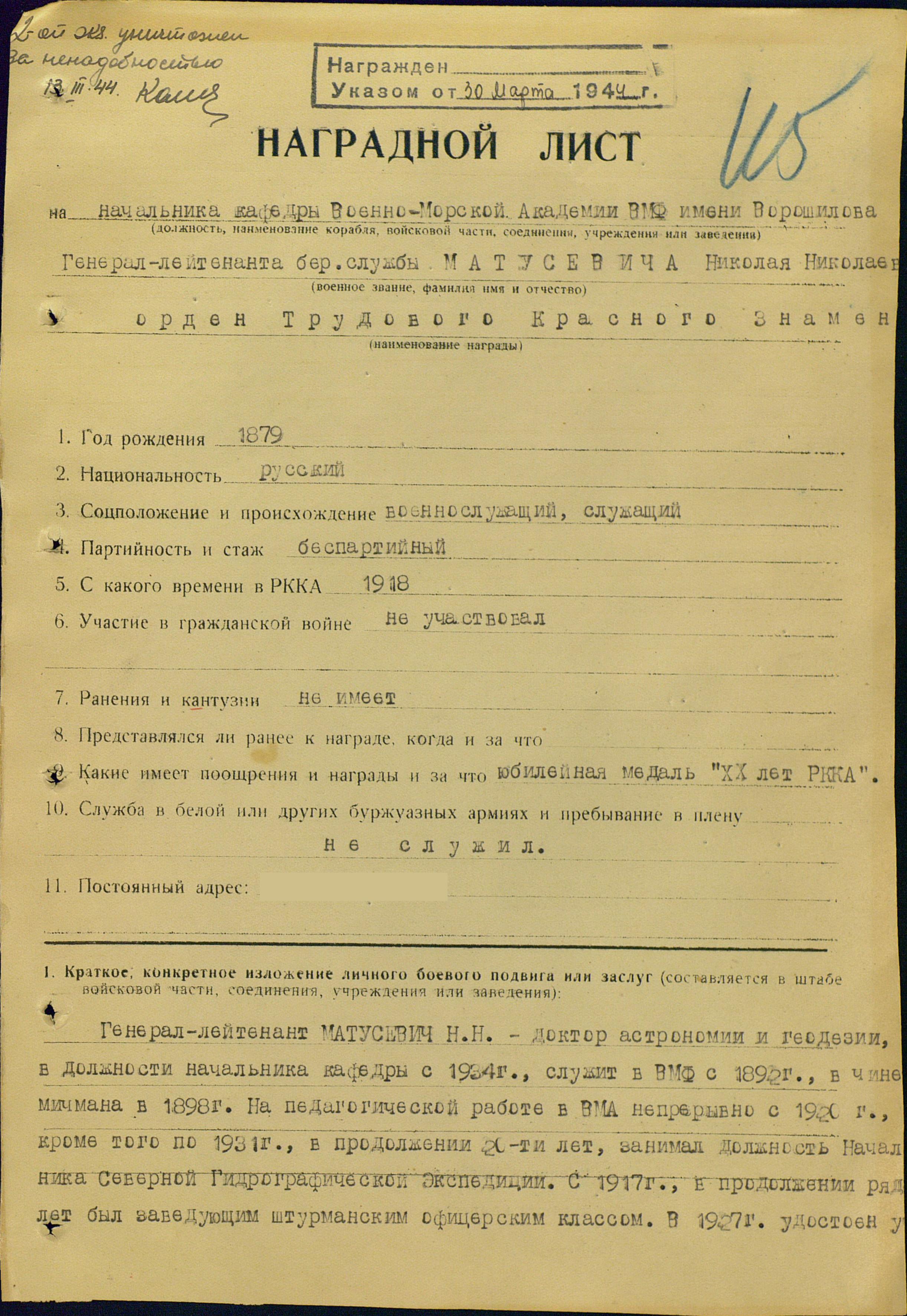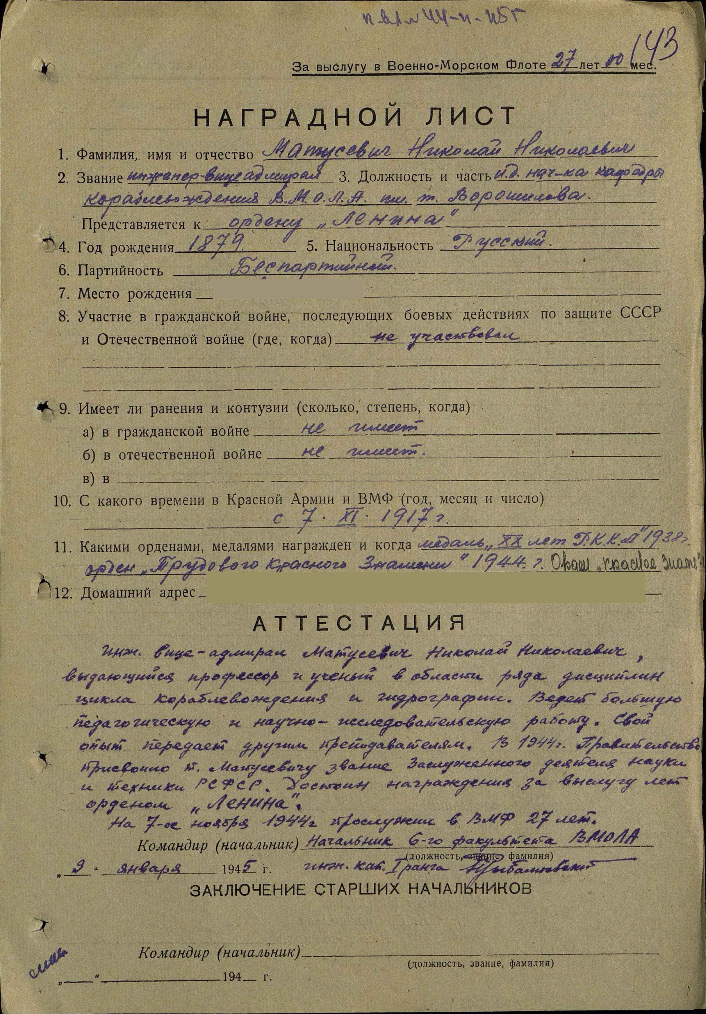 «Николай Николаевич Матусевич (1879 – 1950) – инженер-вице-адмирал, советский гидрограф-геодезист, исследователь Арктики, профессор, доктор физико-математических наук, заслуженный деятель науки и техники, вице-президент Географического общества Союза ССР. Окончив Морской корпус, плавал в конце XIX – начале XX в. в Черном море и Тихом океане. Окончив затем гидрографическое отделение Морской Академии, участвовал в 1904 – 05 гг. в русско-японской войне старшим штурманом на крейсере "Терек", присоединившемся к эскадре вице-адмирала Рожественского у о. Мадагаскар. После войны окончил Петербургский университет, снова зачислен во флот и прикомандирован к Пулковской обсерватории для усовершенствования в геодезии и астрономии. В 1911 г. назначен начальником отдельной съемки (позднее преобразованной в экспедицию) Белого моря и с этого времени в течение двадцати лет руководил – главным образом в Белом и Баренцовом морях — гидрографическими работами… в 1923 г. был начальником Северного гидрографического отряда; метеорологическая станция на Новой Земле, созданная им у восточного входа в пролив Маточкин Шар, была развернута в постоянную полярную геофизическую обсерваторию, в то время самую северную в мире. Из обширных работ, в которых он принимал личное участие, выделяются систематические детальные гидрографические исследования Мурманского побережья и особенно Белого моря, в частности – исследования течений в Горле Белого моря. Всего за свою службу на флоте Н.Н. Матусевич прошел около 160 тыс. морских миль».
