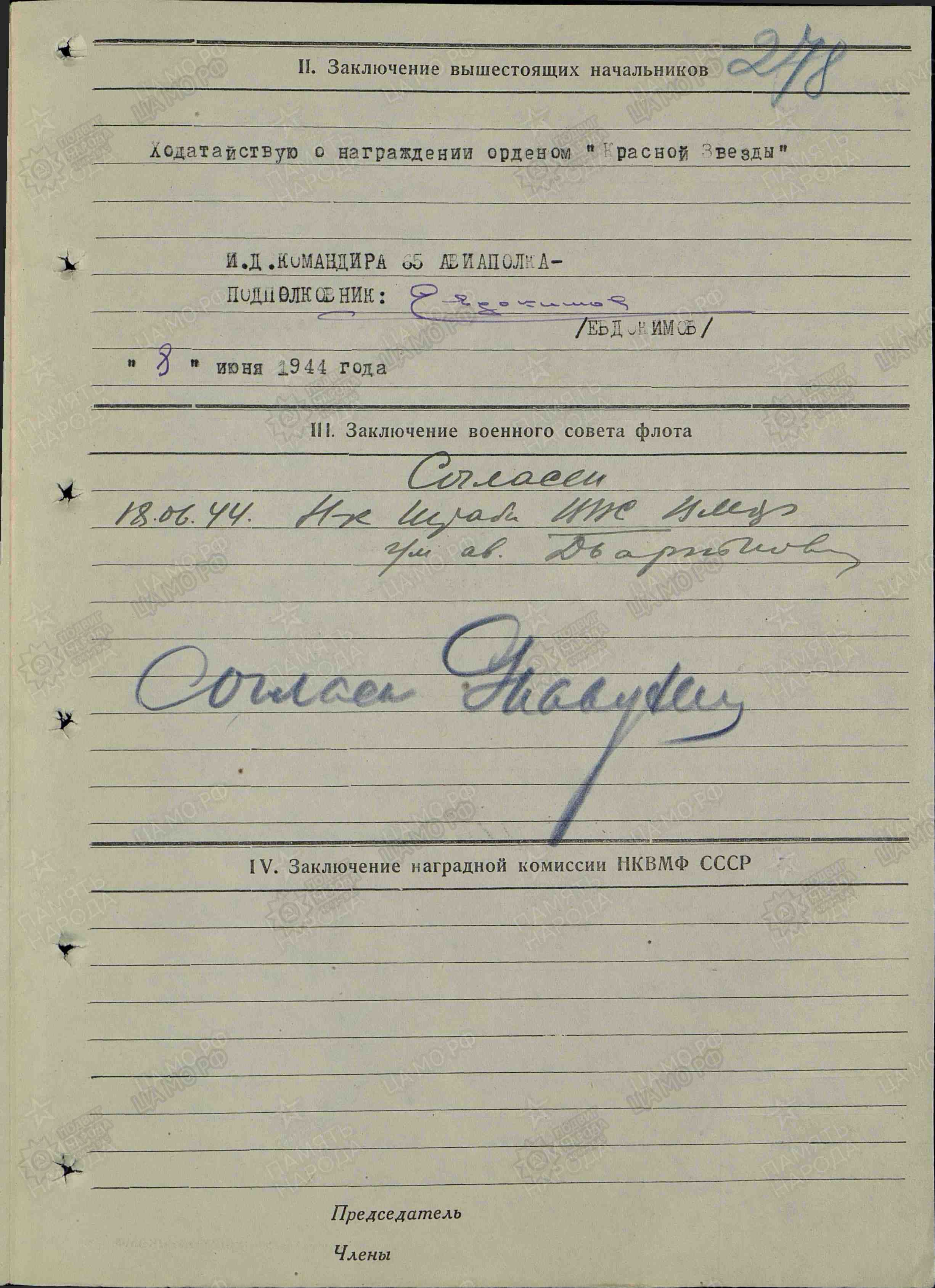 За честный и долголетний труд в советской авиации и непосредственную помощь действующим частям по доставке военных грузов достоин награждения правительственной наградой - орденом "Красной Звезды".