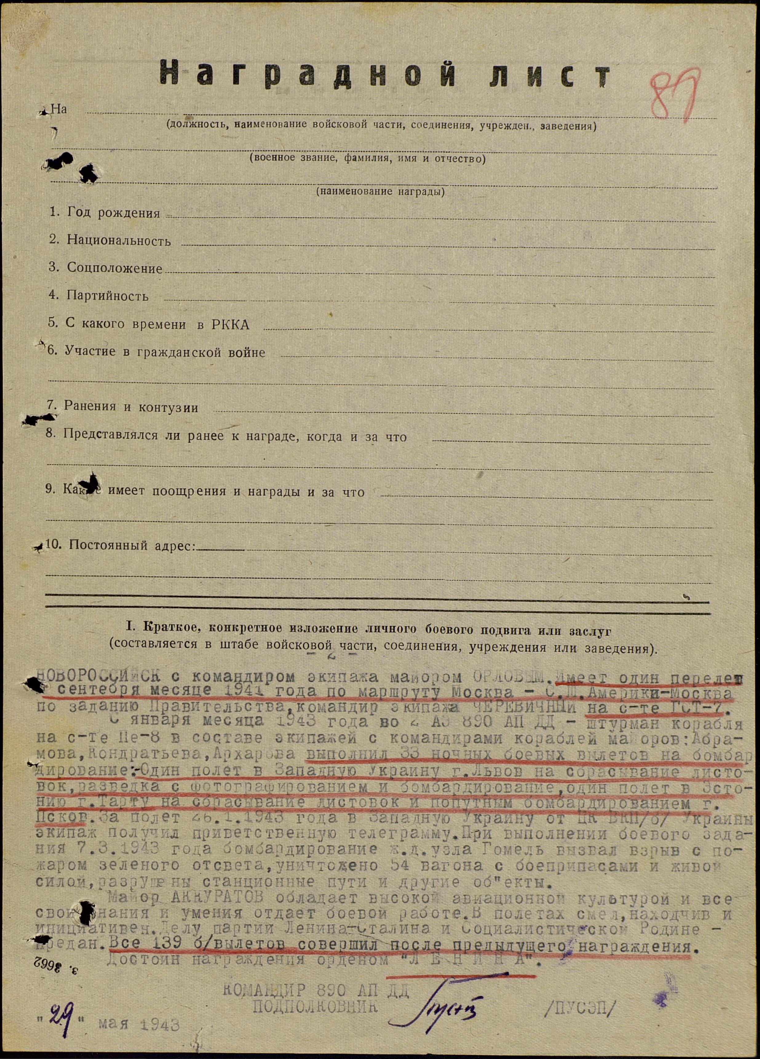 Майор АККУРАТОВ обладает высокой авиационной культурой и все свои знания и умения отдает боевой работе. В полетах смел, находчив и инициативен. Делу партии Ленина-Сталина и Социалистической Родине - предан. Все 139 б/вылетов совершил после предыдущего награждения.