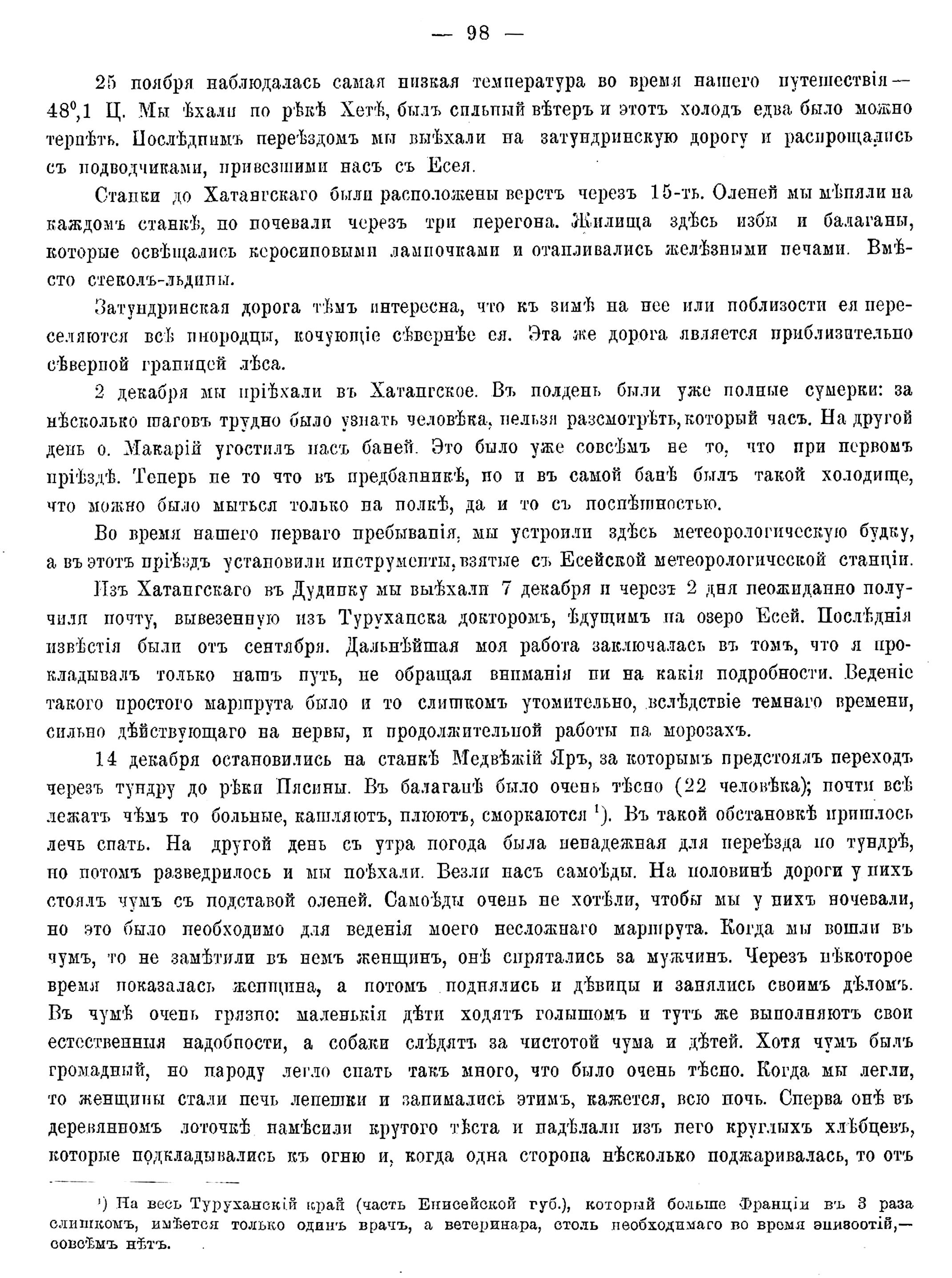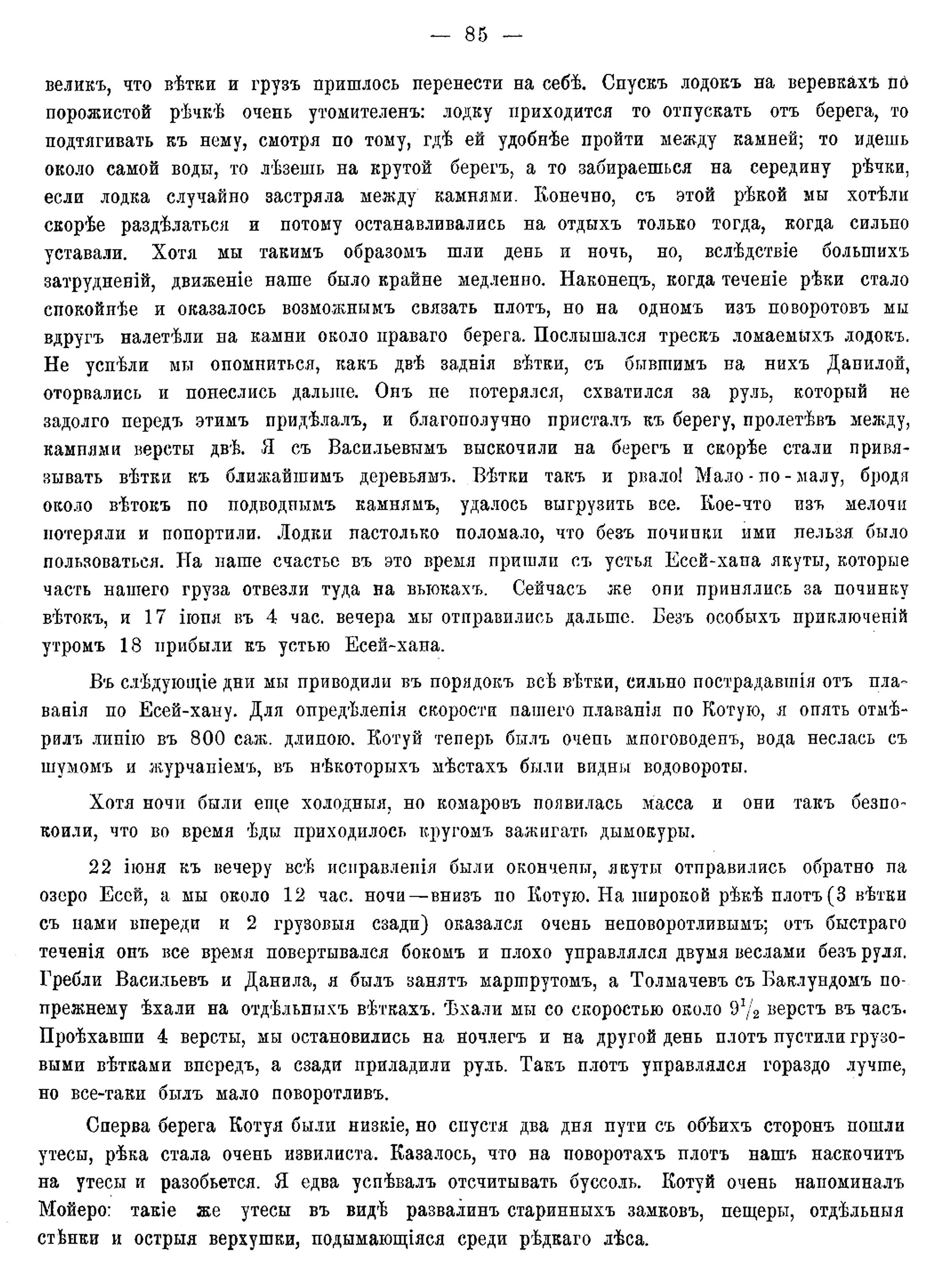 Обиліе нерабочаго времени позволяло намъ также почти регулярно черезъ двѣ недѣли устранвать баню. Для этого у ближайшаго къ лагерю ручья складывали изъ камней печку, дѣлали 2 лавки и полъ съ такимъ расчетомъ, чтобы надъ всѣмъ этимъ можно было поставить палатку. Когда печка достаточно накалена, офицеры и рабочіе мылись всегда съ большимъ удовольствіемъ.