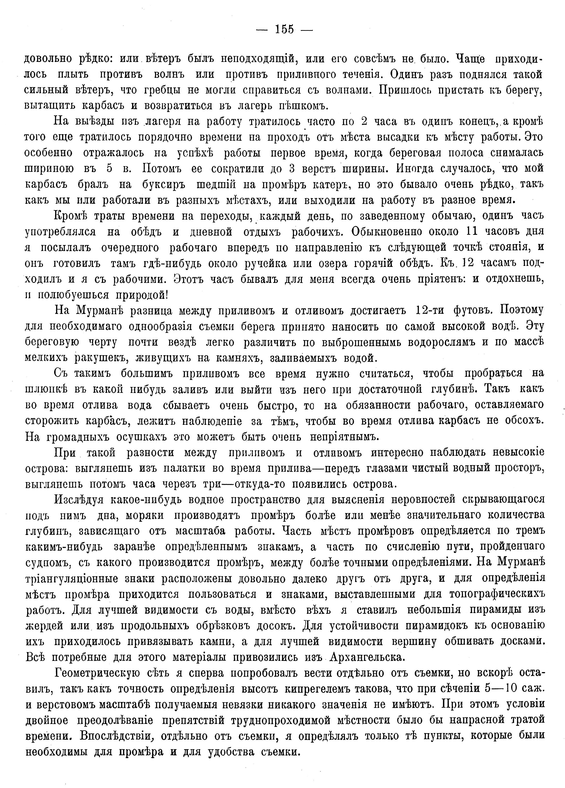 На выѣзды изъ лагеря на работу тратилось часто по 2 часа въ одинъ конецъ, а кромѣ того еще тратилось порядочно времени на проходъ отъ мѣста высадки къ мѣсту работы. Это особенно отражалось на успѣхѣ работы первое время, когда береговая полоса снималась шириною въ 5 в. Потомъ ее сократили до 3 верстъ ширины. Иногда случалось, что мой карбасъ бралъ на буксиръ шедшій на промѣръ катеръ, но это бывало очень рѣдко, такъ какъ мы или работали въ разныхъ мѣстахъ, или выходили на работу въ разное время.