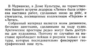 В Мурманске, в Доме Культуры, на торжественном банкете встречи ледореза «Литке» была устроена выставка работ, сделанных мною за рейс, и стенгазеты, посвященные коллективам «Персея» и «Литке».