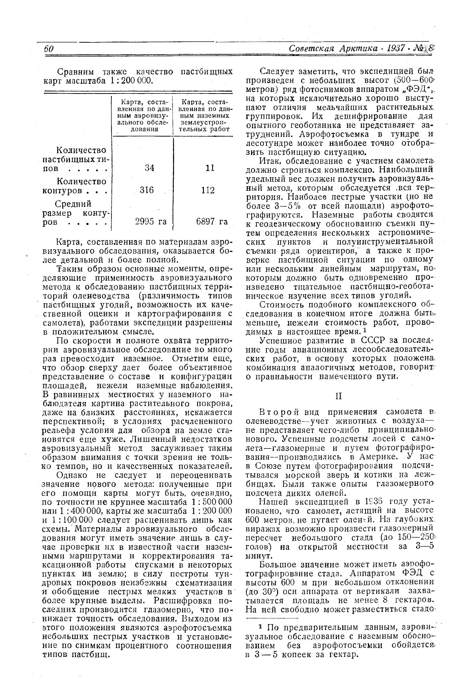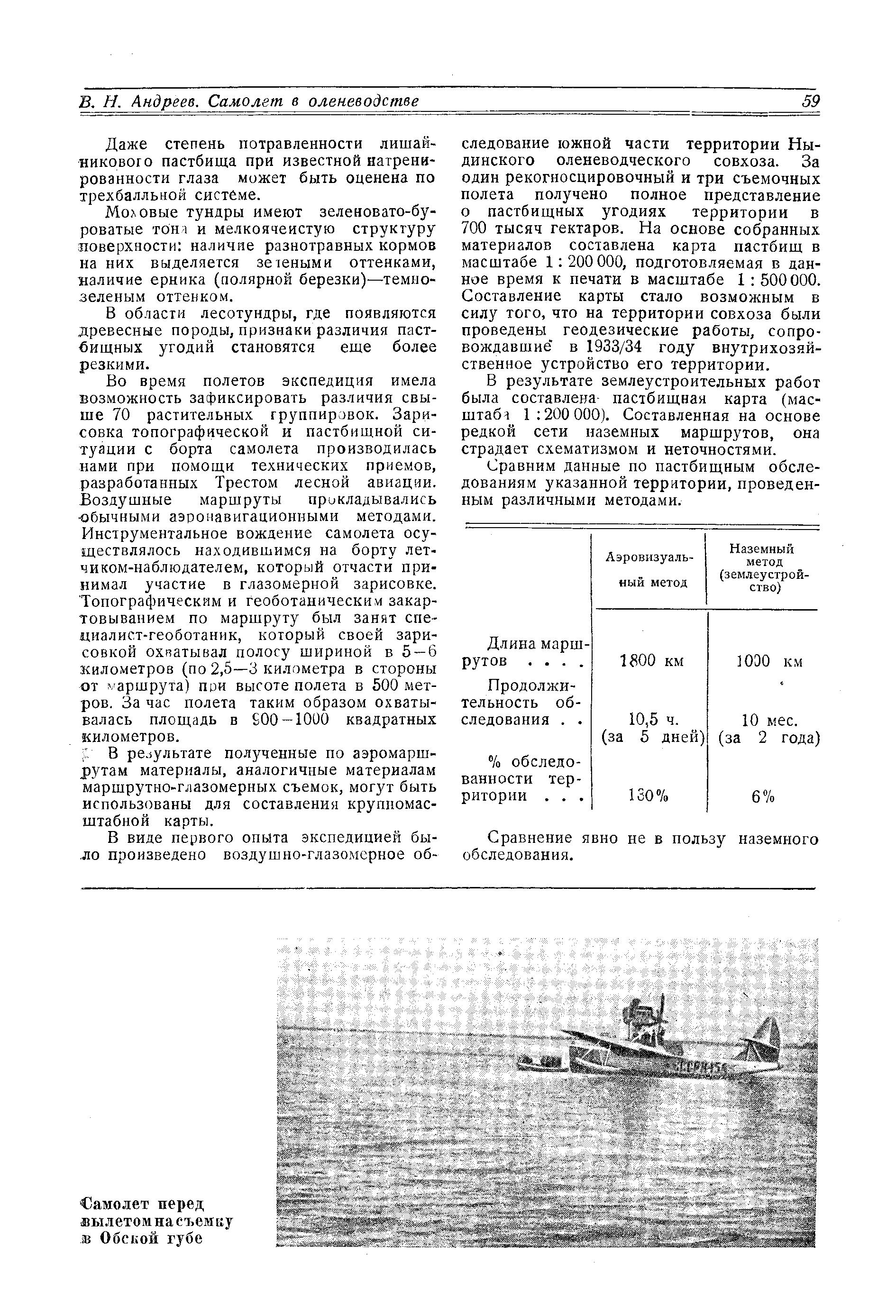 На основе опыта экспедиции следует поставить вопрос об организации в будущем же году воздушно-глазомерного исследования ряда районов Крайнего Севера уже в опытно-производственном масштабе. Одновременно поставить вопрос о разработке метода выборочной аэрофотосъемки. Средняя производительность визуальной съемки с самолета около 50 000 га в час в масштабе 1: 100 000. Ориентировочная стоимость обследования не выше 3 коп. с гектара. Самолет не только ускоряет и удешевляет проведение работ, связанных с организацией пастбищных территорий оленеводства, с составлением геоботанических карт, но и во много раз повышает их качество благодаря осмотру и обследованию всей изучаемой территории, благодаря возможности многократной проверки.
