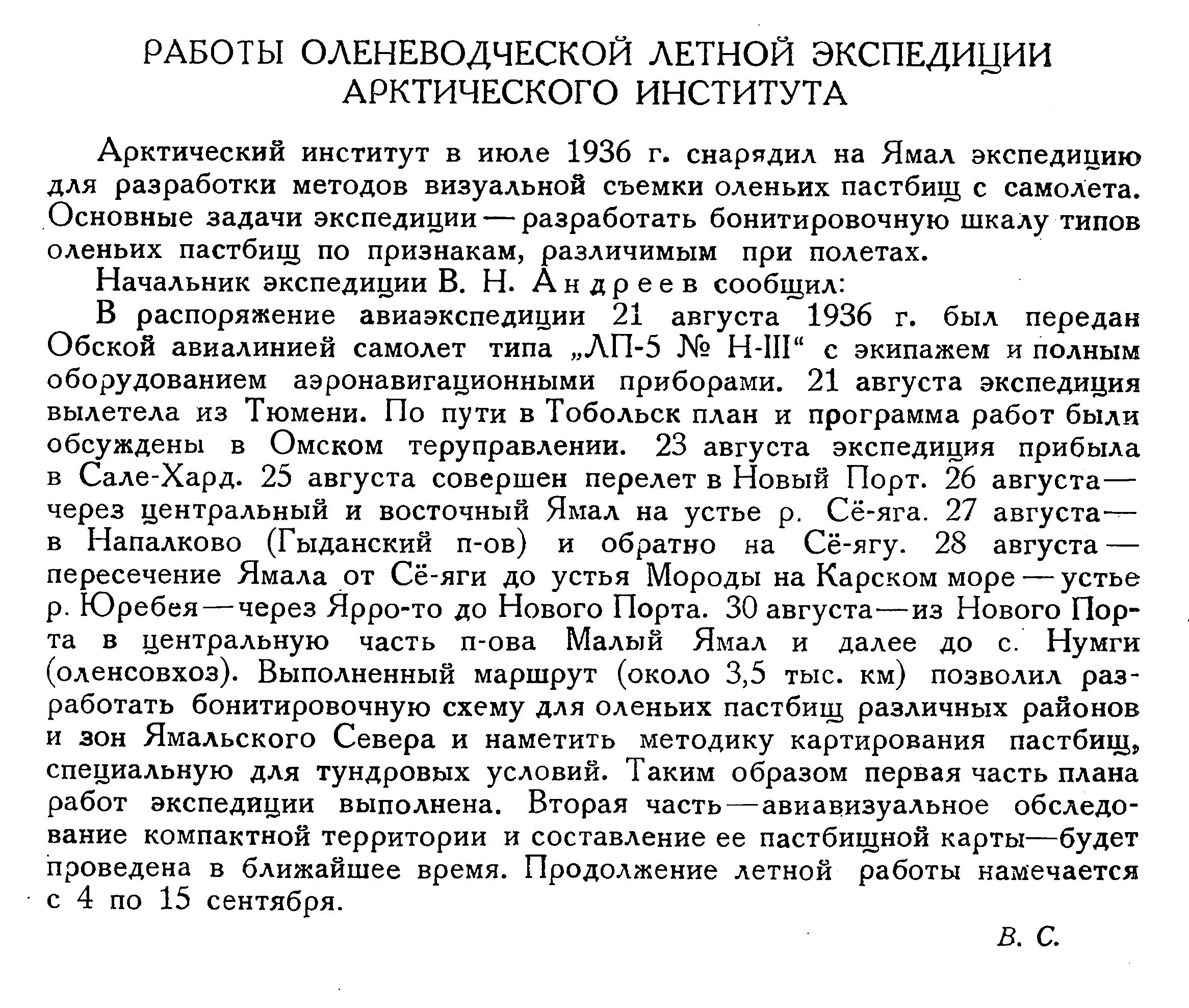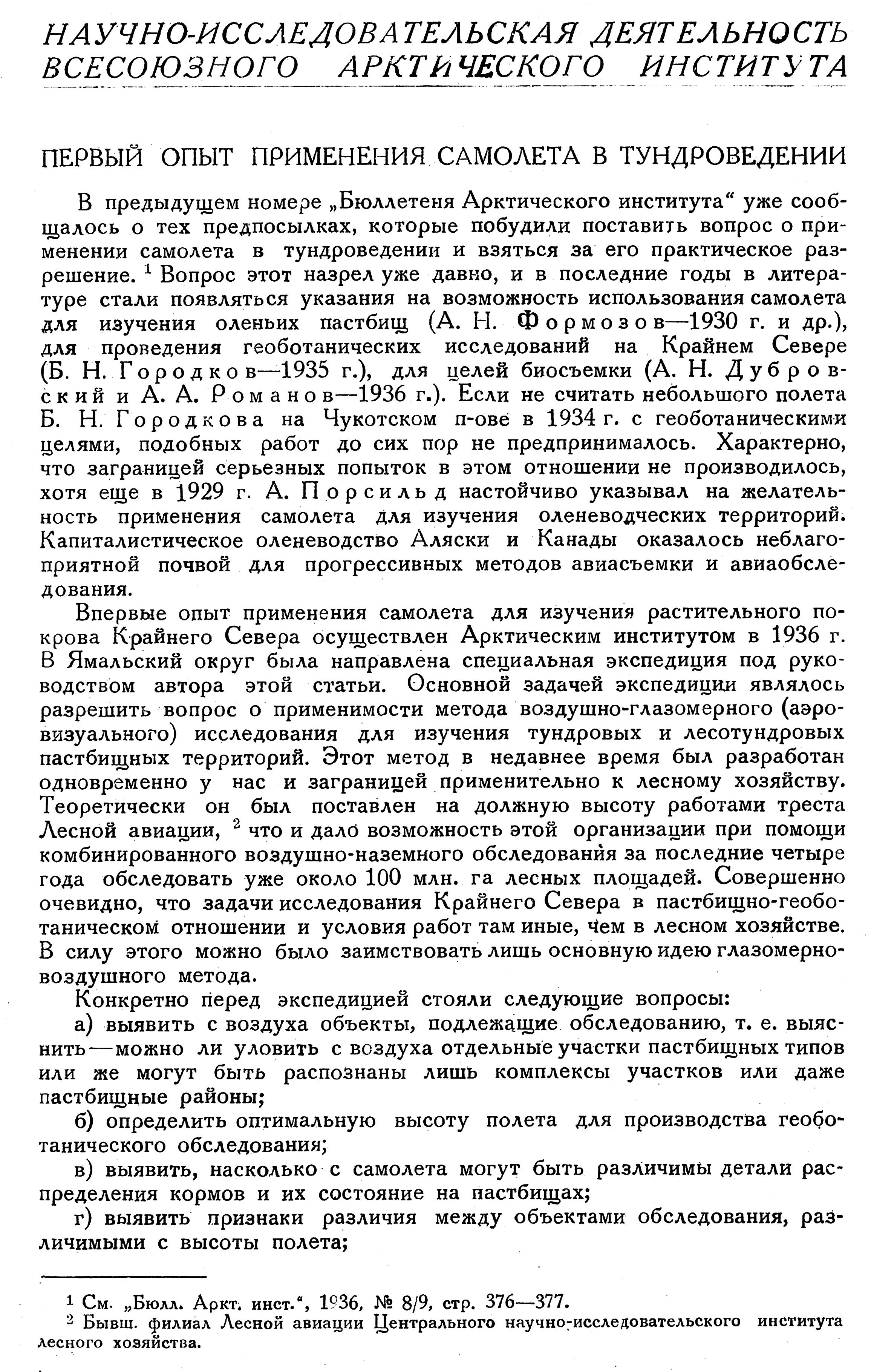 В предыдущем номере "Бюллетеня Арктического института" уже сообщалось о тех предпосылках, которые побудили поставить вопрос о применении самолета в тундроведении и взяться за его практическое разрешение. {1} Вопрос этот назрел уже давно, и в последние годы в литературе стали появляться указания на возможность использования самолета для изучения оленьих пастбищ (А. Н. Формозов — 1930 г. и др.), для проведения геоботанических исследований на Крайнем Севере (Б. Н. Городков — 1935 г. ), для целей биосъемки (А. Н. Дубровский и А. А. Романов — 1936 г.). Если не считать небольшого полета Б. Н. Городкова на Чукотском п-ове в 1934 г. с геоботаническими целями, подобных работ до сих пор не предпринималось. Характерно, что заграницей серьезных попыток в этом отношении не производилось, хотя еще в 1929 г. А. Порсильд настойчиво указывал на желательность применения самолета для изучения оленеводческих территорий. Капиталистическое оленеводство Аляски и Канады оказалось неблагоприятной почвой для прогрессивных методов авиасъемки и авиаобследования.