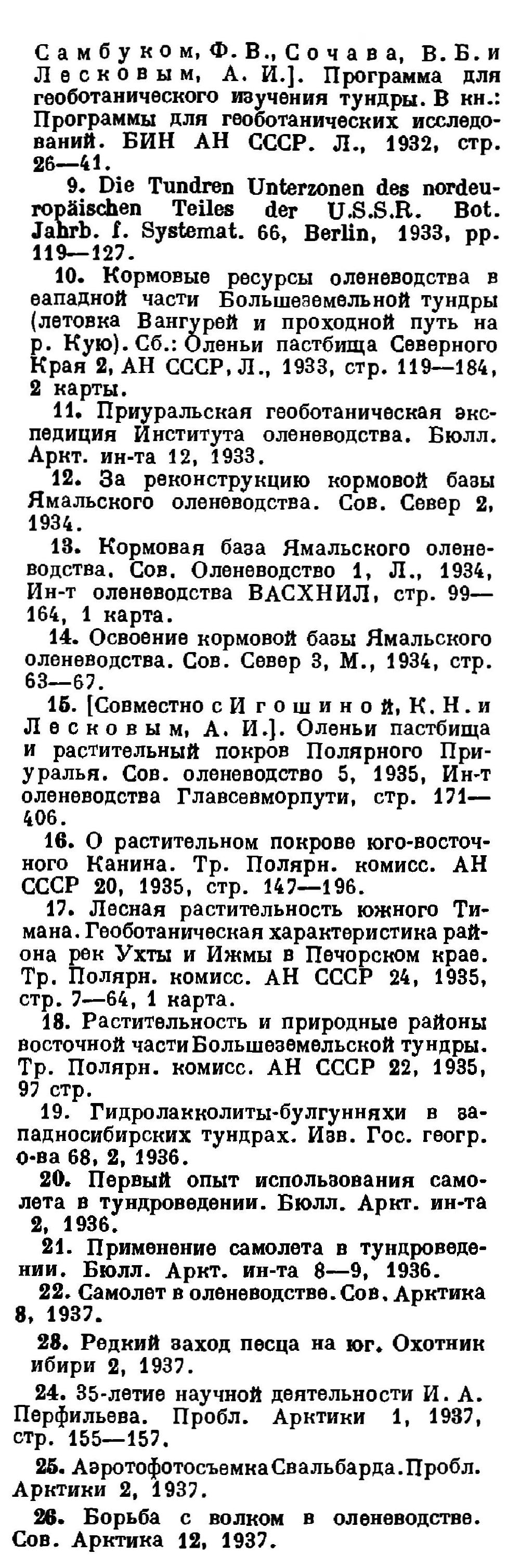 28. Опыт воздушно-глазомерного обследования пастбищ на Ямальском севере. Тр. Ин-та полярн. землед., сер. оленеводство 1, 1938.